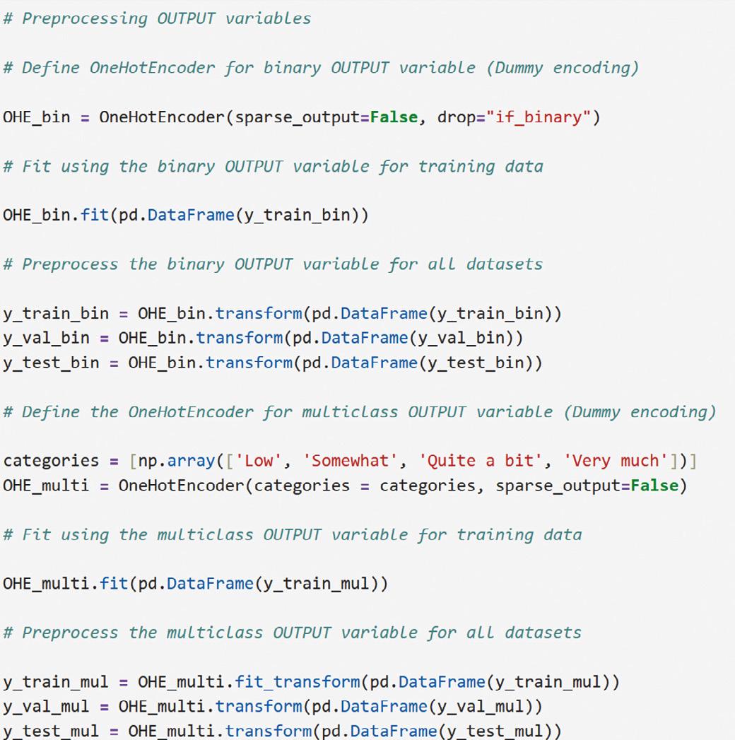 We will also need to preprocess our categorical output features. We also preprocess categorical output features or target variables. For binary targets, we encode classes as 0 and 1. For multiclass targets, OneHotEncoder transforms the target variable into a one-hot encoded vector, representing the correct class with a 1 and others with 0. Fitting the OneHotEncoder to the target values ensures consistent encoding across all datasets, preparing the output features for classification models (Figure 6).