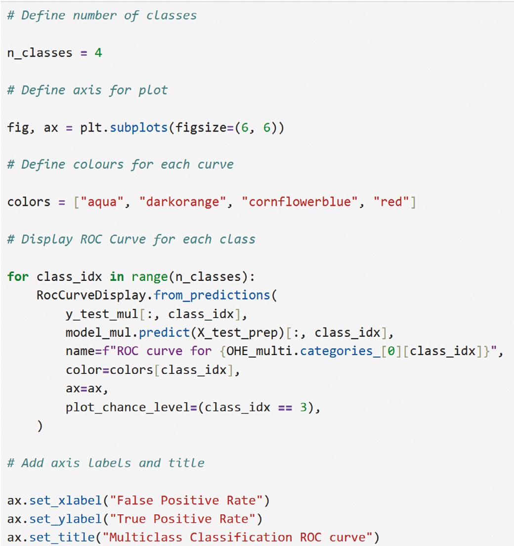 To create the ROC curve plot we need to use the one-versus-rest approach again and compute a ROC curve for each class separately. Therefore, when computing the ROC curve for the i’th class, we need to pass the i’th index of both the target outcome and the predicted probabilities to the RocCurveDisplay function. As this has to be repeated for each class, we will run the code inside a for loop and attach a different colour for each curve (Figure 28).