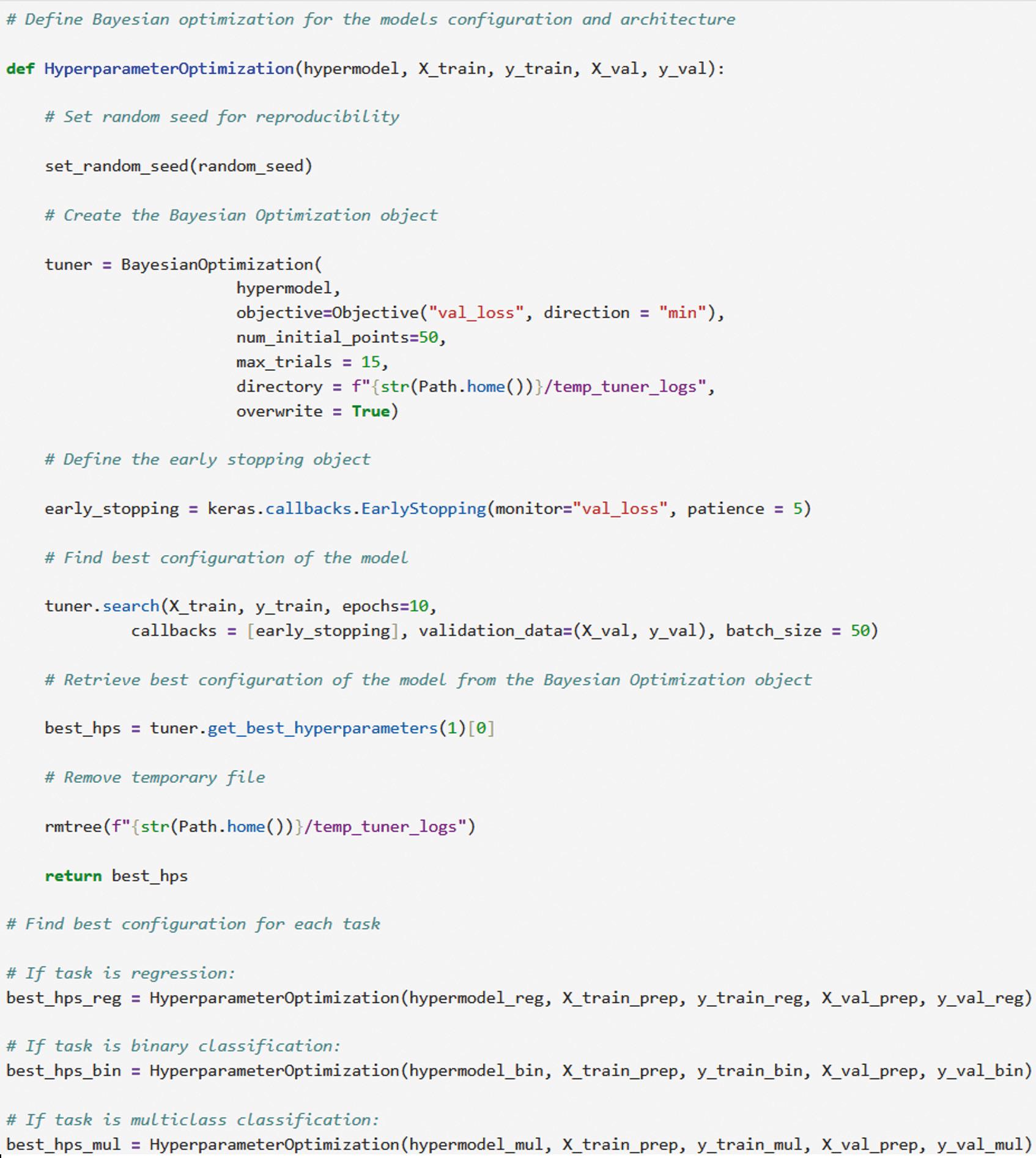 optimization, a smart search method. To avoid overfitting, we use the validation loss (performance on data the model has not seen) to measure model quality, not the training loss. We also use early stopping: if the validation loss stops improving, we halt training. We define a function that sets up this Bayesian optimization tuner, embeds the model within, and includes early stopping. This function uses training and validation data, the early stopping configuration, sets maximum epochs, and sets the training batch size. The function searches for the best hyperparameters and returns them for the model. The following script includes the Bayesian optimization for the models’ configuration and architecture (Figure 8).