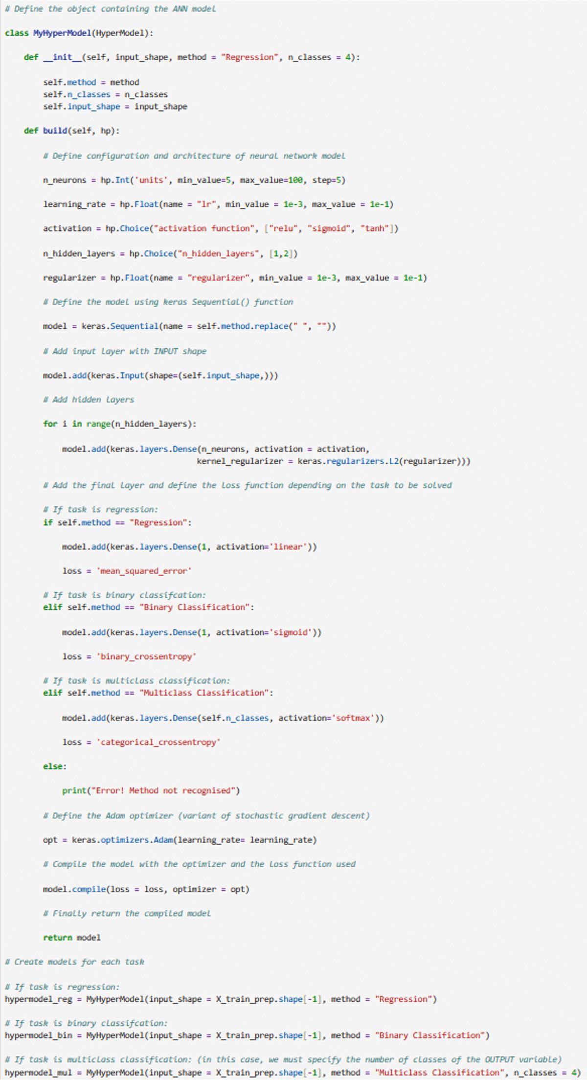 We create a template class for neural network models using the Keras library. The class requires a “method” parameter (regression, binary, or multiclass classification) to specify the problem type. The Keras Sequential API simplifies model building with automatic differentiation. We define hyperparameters using the keras-tuner library, “tuning” “float”, “int”, or “categorical values” during the hyperparameter tuning process. The following script shows the code for the MyHyperModel class, which inherits from Keras’ HyperModel and defines the build method. The build method defines hyperparameters like the number of neurons, learning rate, activation function, number of hidden layers, and regularizer. The model is built using the Keras Sequential API using these hyperparameters. Depending on the “method” specified, the appropriate output layer and loss function are selected for regression, binary classification, or multiclass classification. Finally, the Adam optimizer is defined, and the model is compiled. Finally, example models are created for regression, binary classification, and multiclass classification tasks (Figure 7).