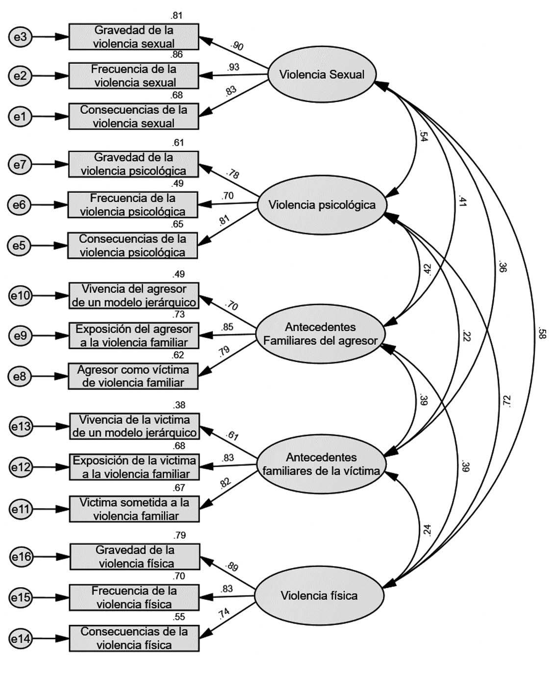Los resultados iniciales para el análisis factorial confirmatorio identificaron una no normalidad multivariante para los 16 indicadores (CR = 7.66); a la vez se identificaron mediante la distancia de Mahalanobis valores atípicos multivariantes (< .001), por lo que se procedió a eliminar 25 casos, reduciéndose la muestra a 482 casos, obteniendo así una normalidad multivariada de datos (CR = 1.88). Se obtuvo a través del método de estimación de máxima verosimilitud un diagrama de ruta conformado por 16 indicadores y 5 variables latentes, con 4 indicadores para la variable violencia psicológica, 3 indicadores tanto para la variable violencia sexual, violencia física, antecedentes familiares del agresor y para la variable antecedentes familiares de la víctima.