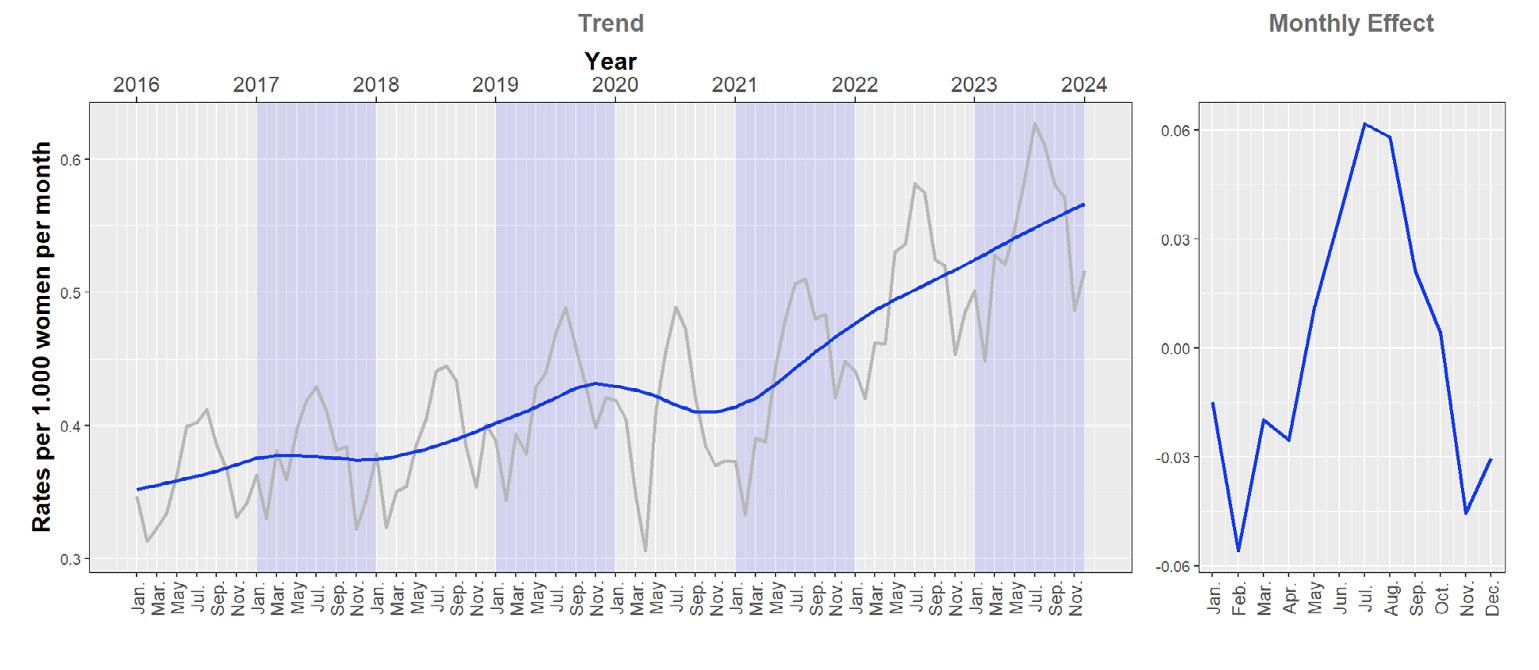 Figure 2. Monthly Trends and Seasonal Effects of Police-recorded IPVAW Rates (Spain, 2016-2023).