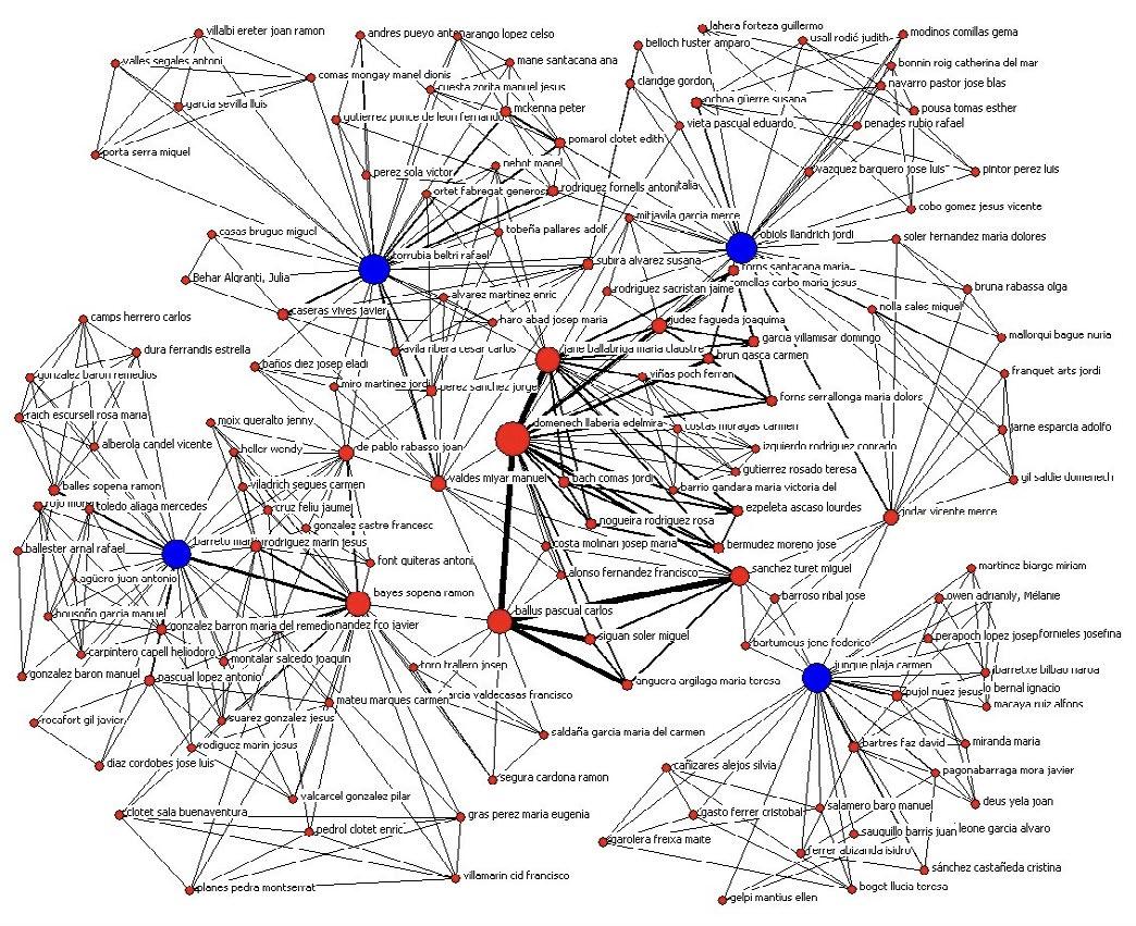 La figura 1 recoge la red de colaboración entre miembros de tribunales aplicando un umbral o intensidad de colaboración de su presencia en 15 o más tribunales de tesis. De estos, se han seleccionado aquellos que han sido directores o codirectores de tesis en colaboración interdisciplinar. Se puede observar la existencia de siete grandes grupos. Entre estos, destaca el grupo formado por dos investigadoras, Edelmira Doménech Llaberia (Psiquiatría) y María Claustre Jane Ballabriga (Psicología) compartiendo dirección o tribunales con 23 investigadores más, ambas de la UAB en el Departamento de Psicología Clínica y de la Salud. Un segundo grupo relevante es el de Carlos Ballús Pascual y Miguel Sánchez Turet de la UB, compartiendo dirección o tribunales con otros 15 investigadores. El tercer grupo está formado por el psicólogo Ramón Bayés Sopena (UAB), compartiendo colaboración con 35 investigadores más. Éste a su vez presenta una alta colaboración con otra psicóloga, María Pilar Barreto Martín de la UV, la cual lideraría otro de los grupos con mayores colaboraciones, en concreto con 20 investigadores. Otros grupos relevantes por el número de autores y de representaciones en las tesis son los liderados por Rafael Torrubia Beltri (UAB) y Carmen Junque Plaja (UB).