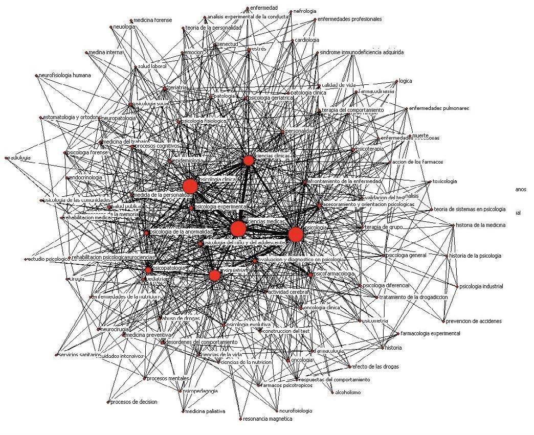 En la figura 2 se recogen las relaciones entre los descriptores con una frecuencia de dos o mayor de las tesis en colaboración interdisciplinar analizadas. Los resultados permiten observar como las mayores relaciones se dan entre cinco grandes descriptores, Psicología clínica, Ciencias médicas, Psicología, Ciencias clínicas y Psiquiatría.