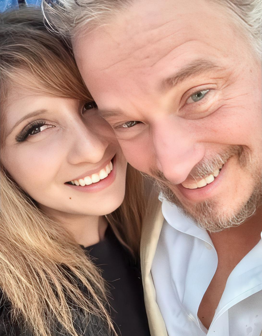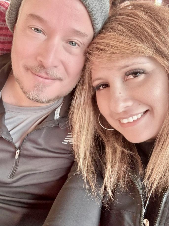 A photo of Amber on display at her Celebration of Life party kissing my cousin in a bathtub of petals; purples, yellows, and reds. Tendrils of her hair spill over the porcelain tub.