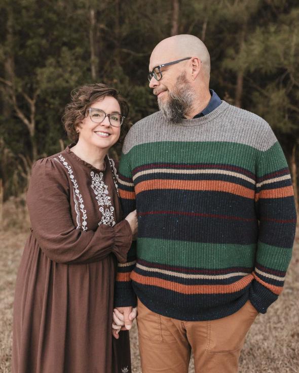 She wears navy trousers printed with tiny pink and purple fowers to Sunday lunch. My cousin is grieving the loss of his girlfriend.
