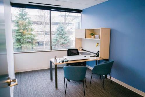 renovated open atrium creates a welcoming environment for office tenants and visitors alike. The coworking center spans 23,000 square feet and includes 86 private office spaces in various configurations, three cutting-edge meeting rooms, multiple phone booths and a lively social hub with high-speed Wi-Fi, comfortable seating and freshly brewed coffee. Whether you’re looking