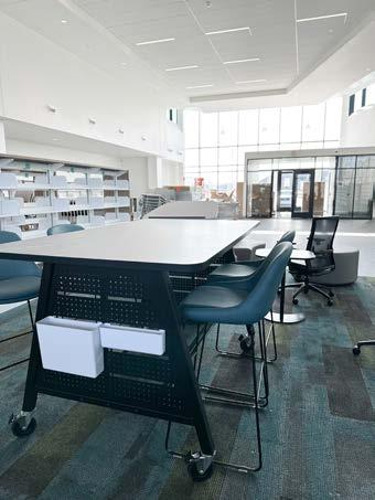 Additionally, the new branch features modern décor with comfortable seating throughout; a designated teen area, which cleverly incorporates garage doors that roll up, seamlessly connecting it to the main hall for easy access and interaction;