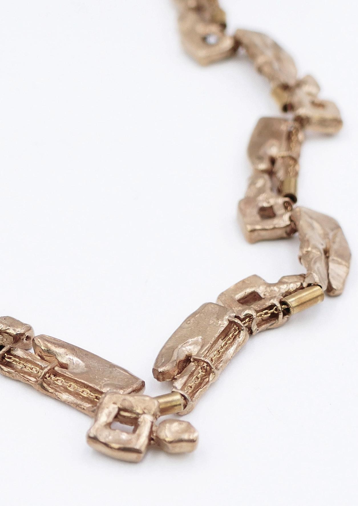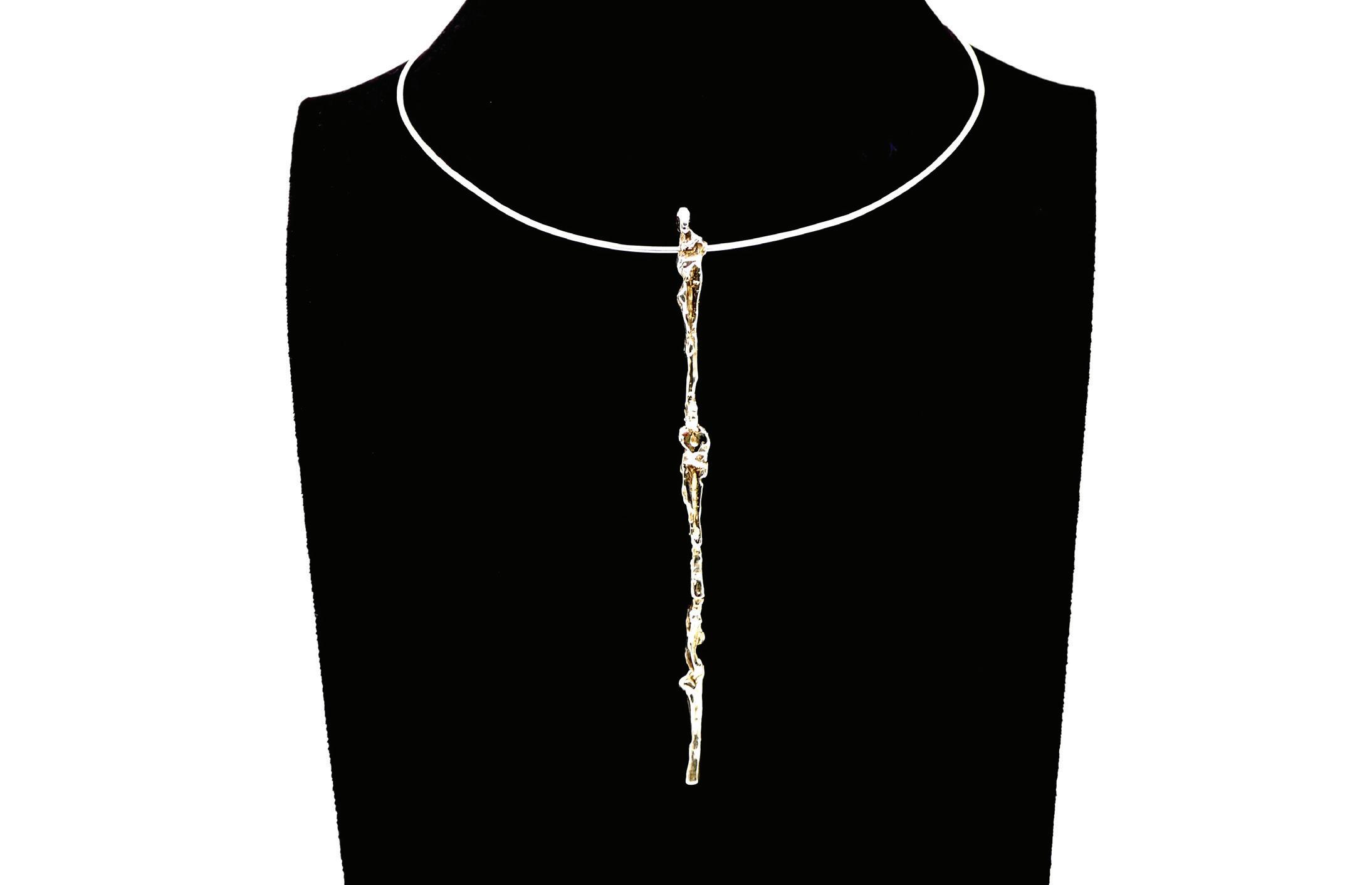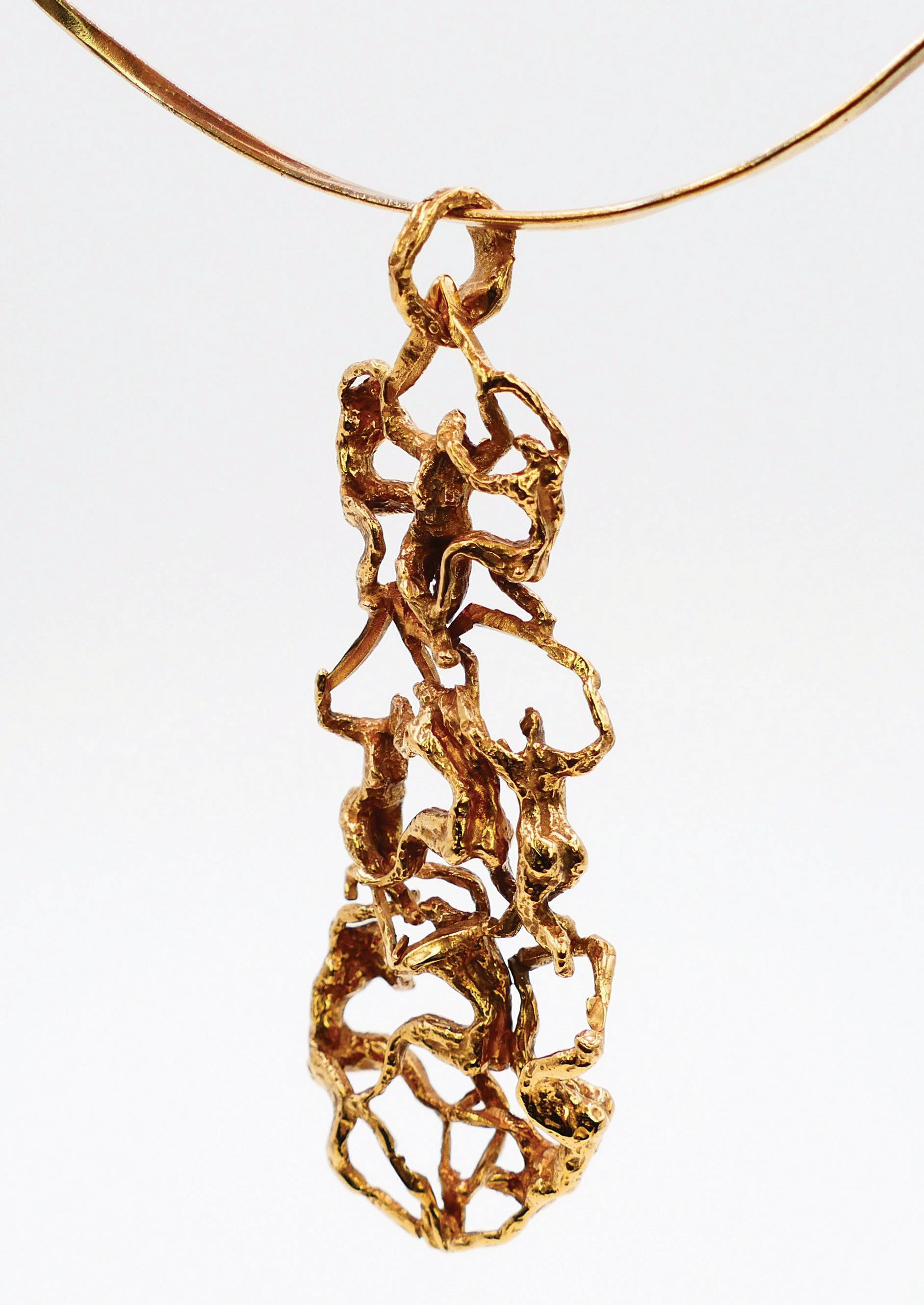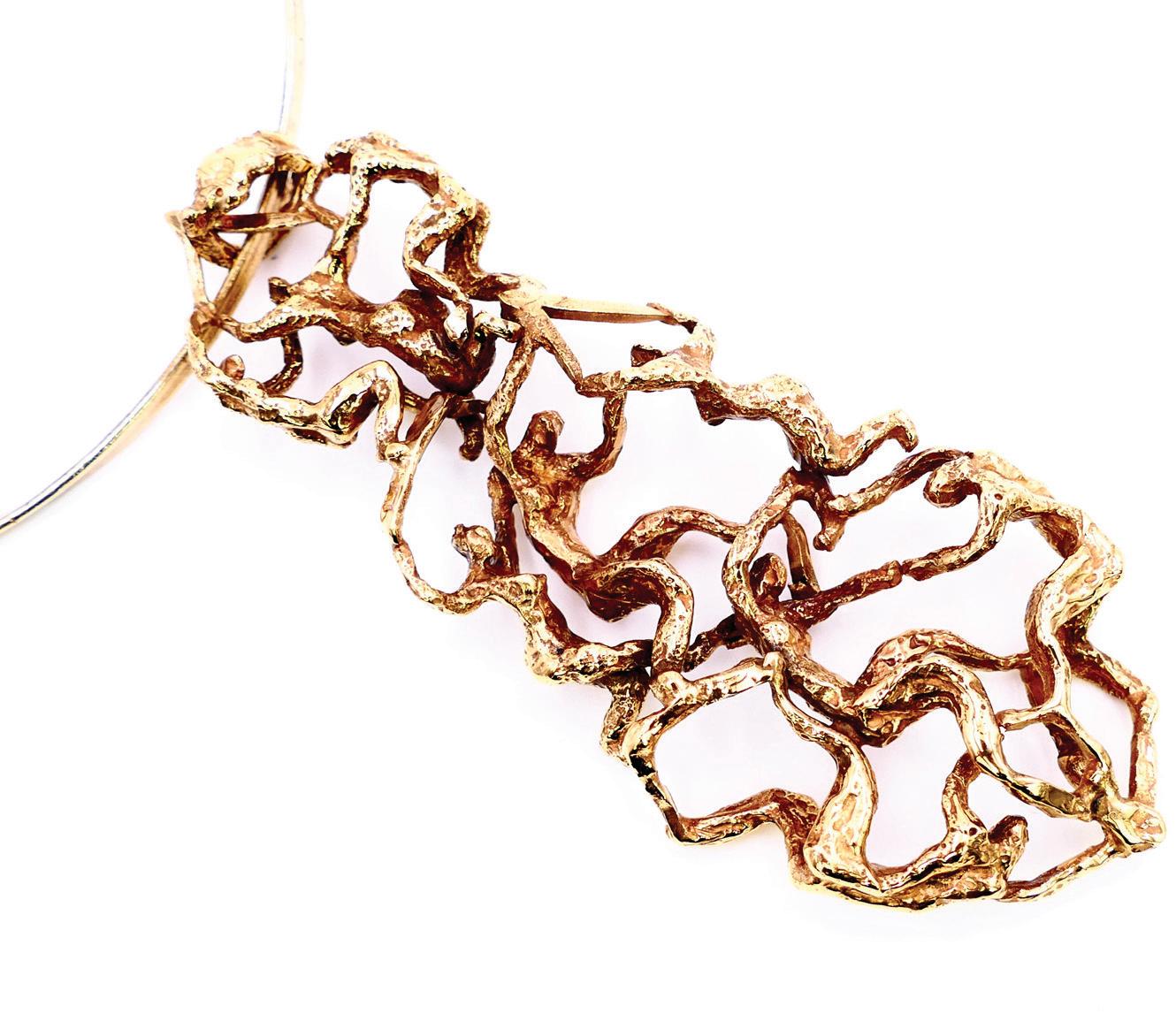Pour moi, un bijou n’est ni une sculpture miniature ni une œuvre à part entière. Il devient bijou, tout simplement. L’œuvre se trouve dans la sculpture — c’est là que je dépose une pensée, une intention. Je pars d’un fragment, d’un élément qui me suggère un bijou. Bijou qui prend vie au contact du corps : il doit être léger, agréable à porter, seyant. Cette contrainte n’existe pas dans la sculpture qui s’installe dans un espace. Quand je vois mes bijoux portés par d’autres, c’est un plaisir : chacun leur donne une présence différente, presque un prolongement vivant de mon geste.