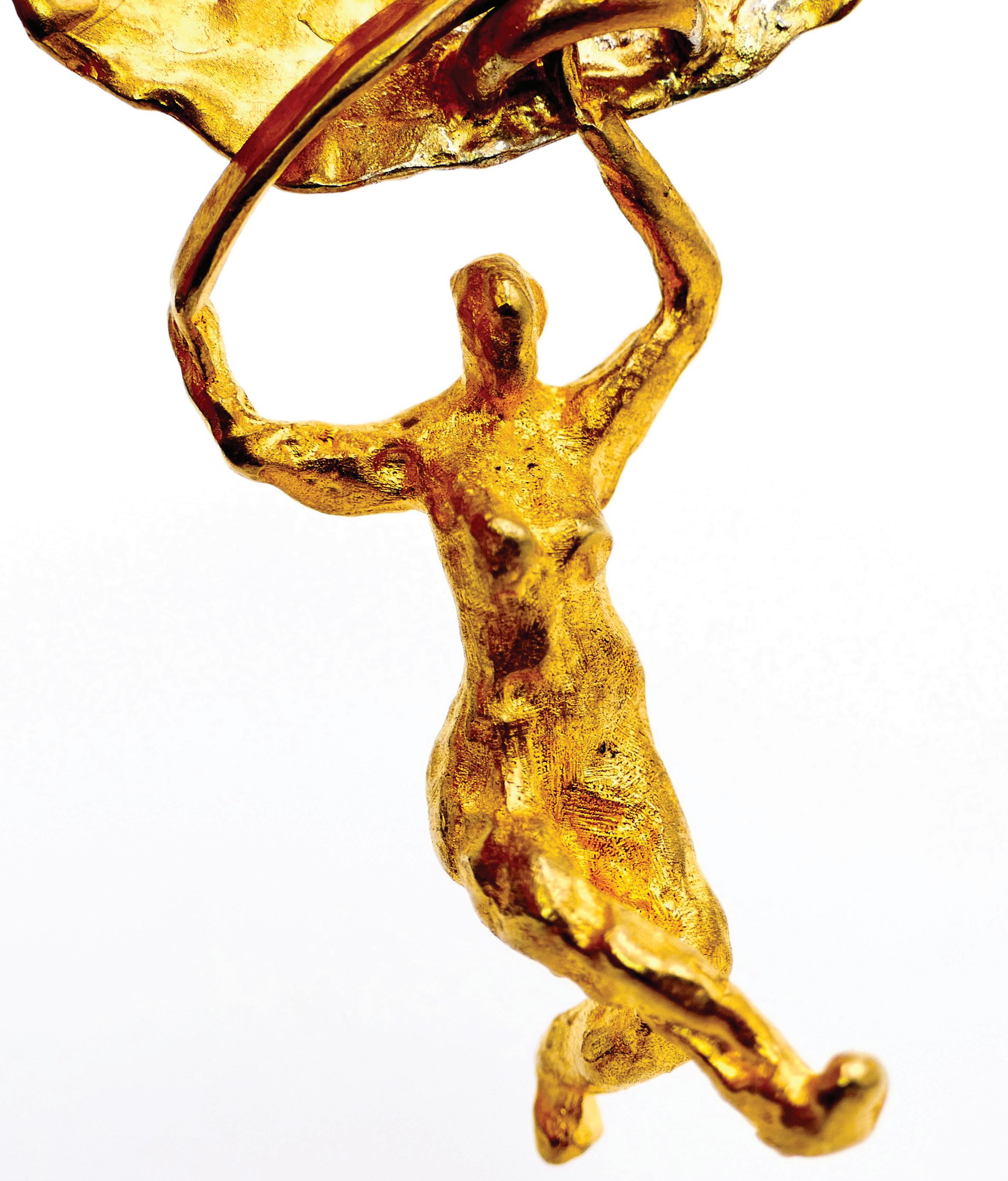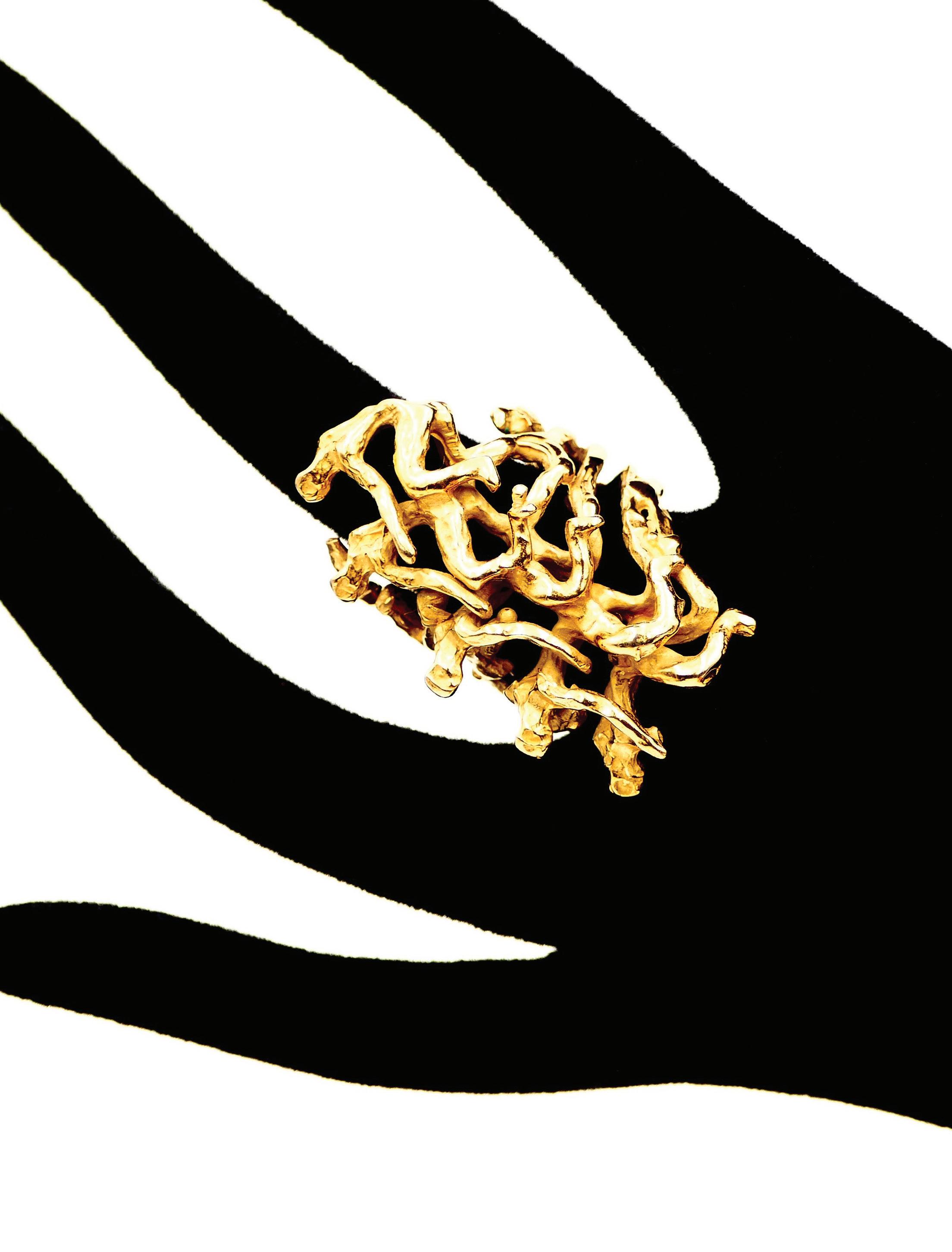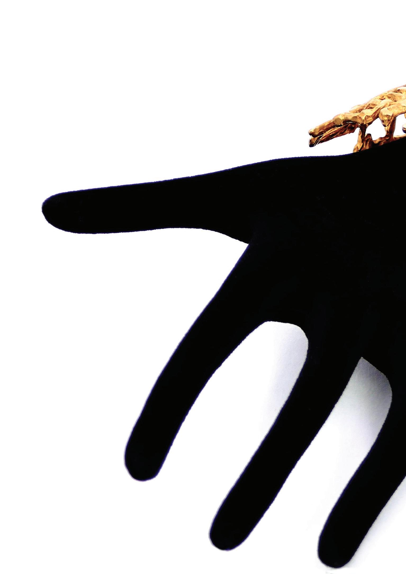 Wax is my material of choice: malleable, it opens up infinite possibilities. It was already at the origin of my sculptures. It allows for incredible precision and lightness, which perfectly match the sense of movement I like to give my jewelry. The choice of material is essential: for the sculptures, bronze, with its ancient soul and strength, gives my pieces a sense of timelessness. In steel, iron, or resin, they would not convey the same message. The techniques are very similar to sculpture: I model the object directly in wax before it is cast by a foundryman, followed by casting, chiseling, and gilding. It’s a complex but wonderful process, full of possibilities, where each step is guided by what I wish to express.