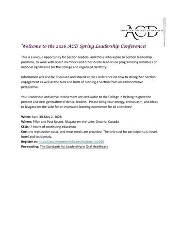 erhaps the very best part of my job is connecting with ACD Fellows from around the country either in person or through zoom meetings and sharing with them our activities and plans for the future. Early this year I visited New York City for their Section meeting and attended the Yankee Dental Meeting, both of which enjoyed significant turnouts by Fellows as well as dental students! So far this year, I have participated in over 20 Section meetings, most of which were in person. I have more meetings planned before we have the chance to get together at our Annual Meeting in Washington, DC.