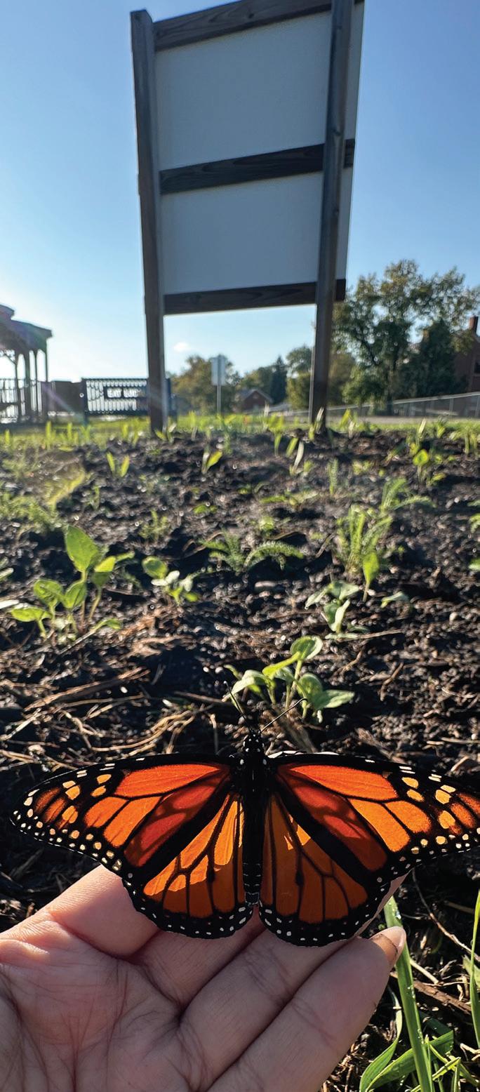 species thoughtfully, prepare seed mixes, and learn practices such as cold stratification and scarification. She often reminds them that growing indigenous seeds isn’t always instantly rewarding; it requires time, cycles, and the right conditions, mirroring her own educational path. Through collaborative projects and large campus engagement events, she shows students how restoration is lived, shared, and celebrated.