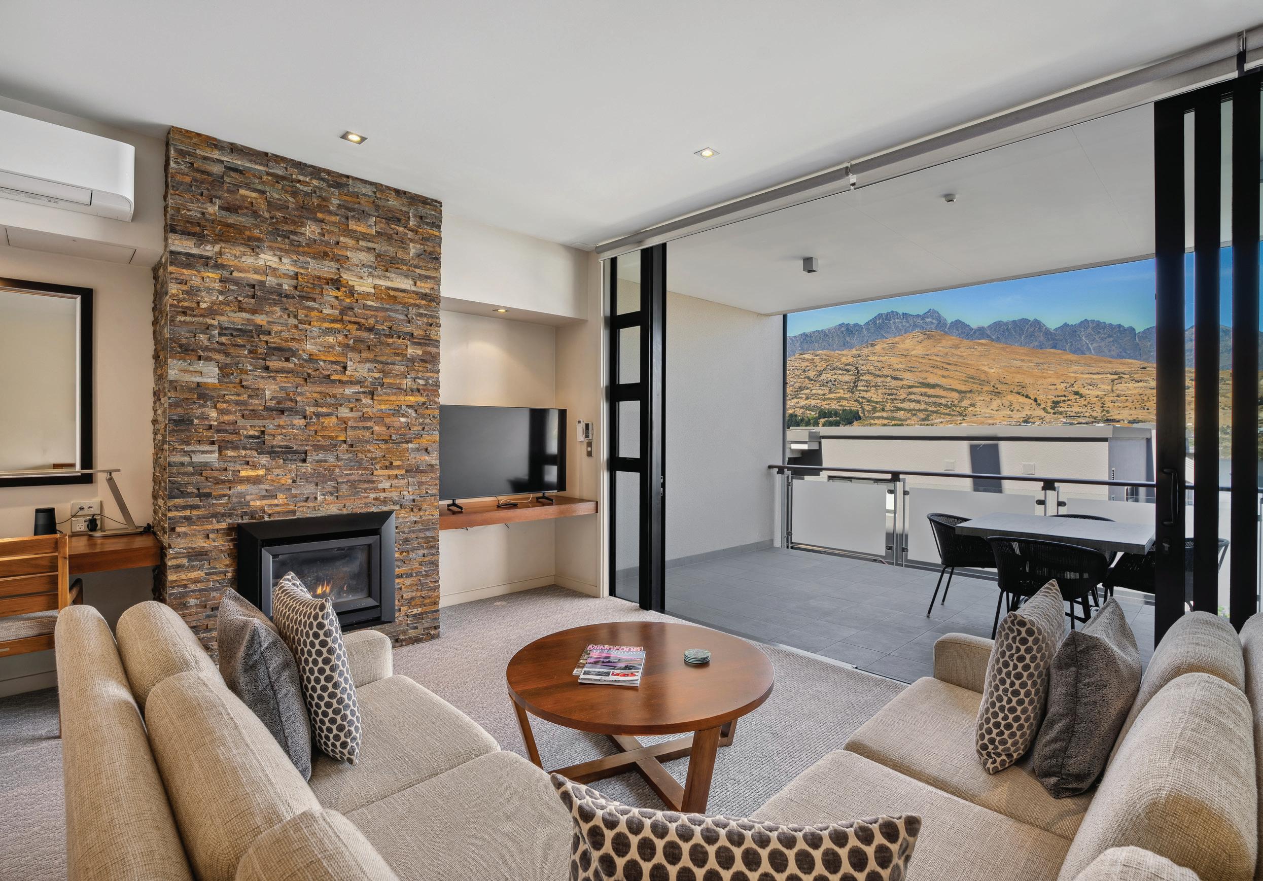 The apartment features two generously sized bedrooms, each offering exceptional comfort and privacy. Wake up to panoramic views of the majestic Remarkables mountain range from the master bedroom, which includes an ensuite bathroom outfitted with sleek fixtures and premium finishes. The second bedroom is equally versatile, ideal for accommodating a second couple or easily converting for childrens’ use.