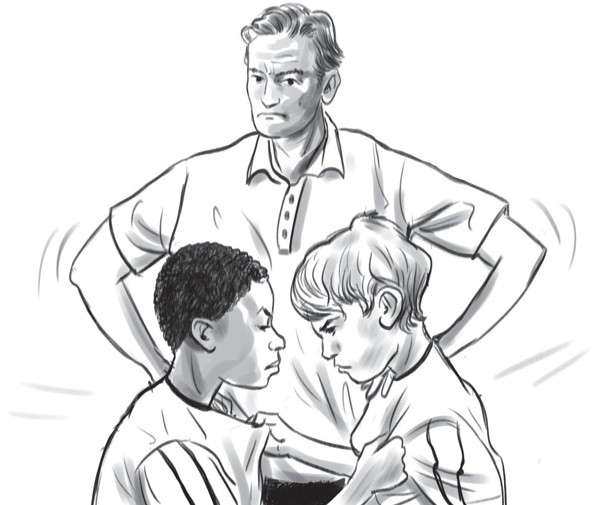 Sam dropped onto the grass and watched the rest of the team jog back onto the pitch. That’s when he remembered the boy by the fence. Sam turned round to see if he was still there. The boy was in goal now, but he saw Sam looking. When his game finished, the boy came over to talk. “The manager was wrong to take you off,” he said to Sam. “You didn’t start the fight.” He pointed at Jordan. “He did.”