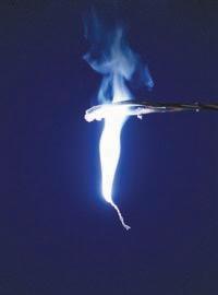 Magnesium oxide forms as a white solid. When distilled water is added to the ash and the mixture is tested with universal indicator, the pH is greater than 7 – the oxide has formed an alkaline solution. ∆ Fig. 7.3 Magnesium burning in oxygen. ∆ Fig. 7.4 Magnesium oxide is a white solid.