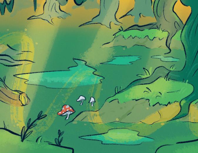 Archie’s adventure began. He made his way through the eerie fog, past towering trees, and over twisted roots.
