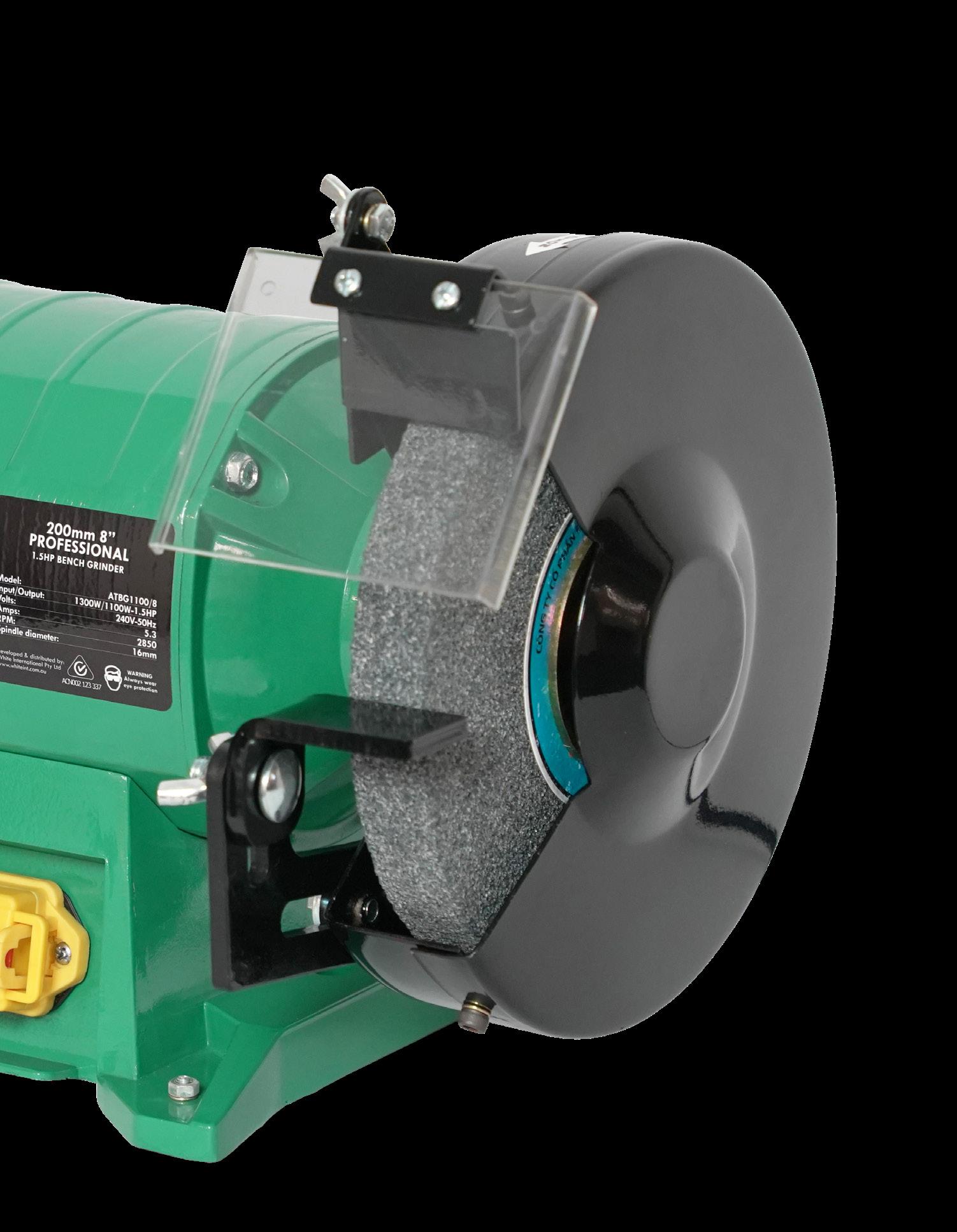 With a robust 1.5HP (1100W) motor at its core, the 8" Professional bench grinder delivers unrivalled power and efficiency while incorporating innovative features for safety and durability. Comes standard with 36 and 60 grit 25mm wide Aluminium Oxide grinding wheels.