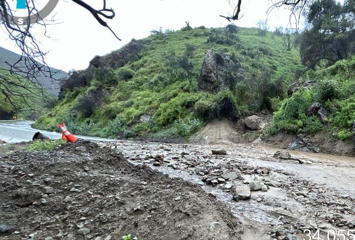 south of Topanga Canyon Boulevard. Motorists are advised to avoid unnecessary travel during storm conditions and to check current traffic updates via Caltrans’ Quickmap before heading out.