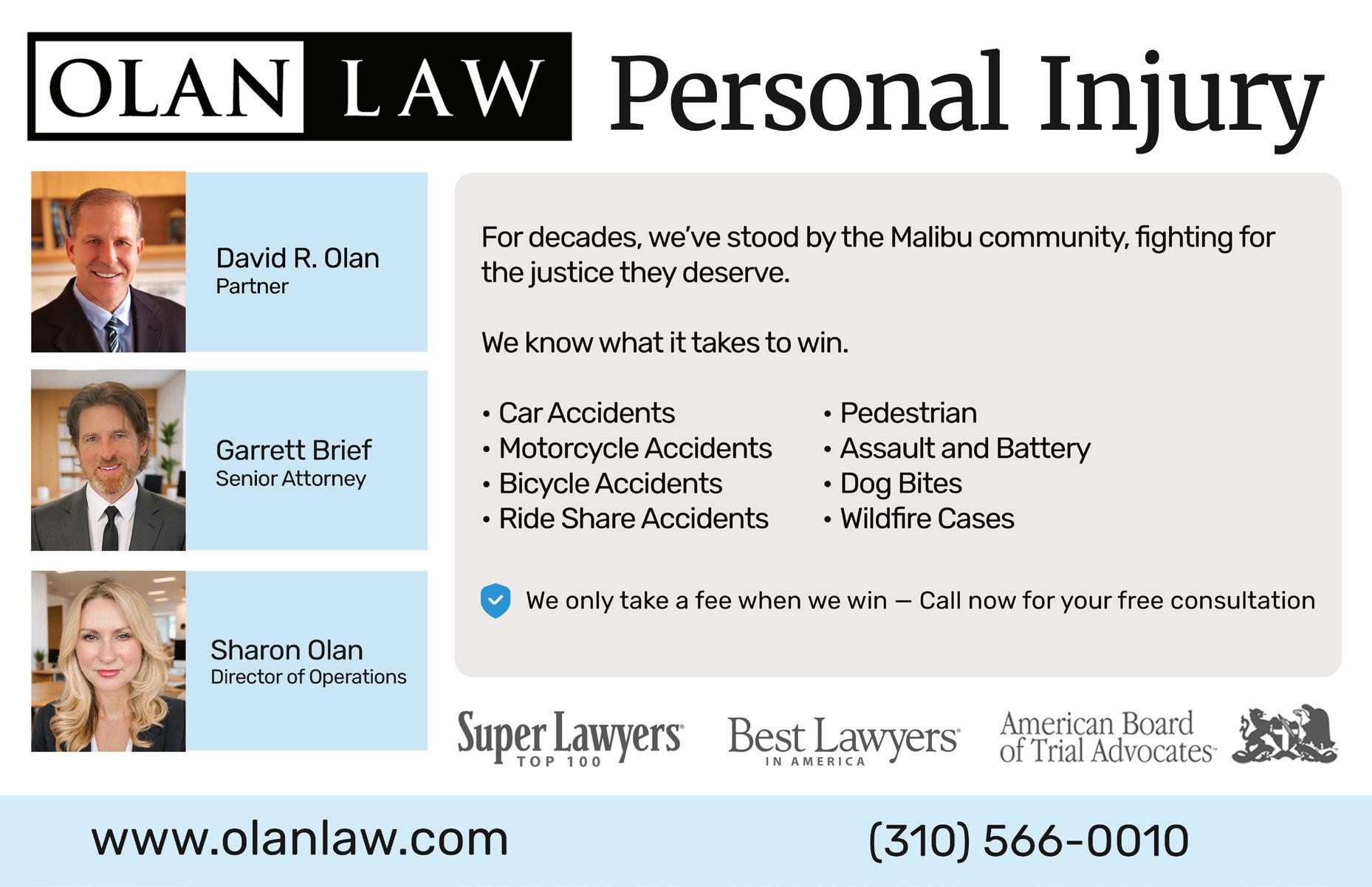 OLAN LAW Personal Injuries, Auto Accidents, Wrongful Death, Uninsured Motorist, Premises Liability, and Product Liability. Call David Olan 310-566-0010 www. olanlaw.com