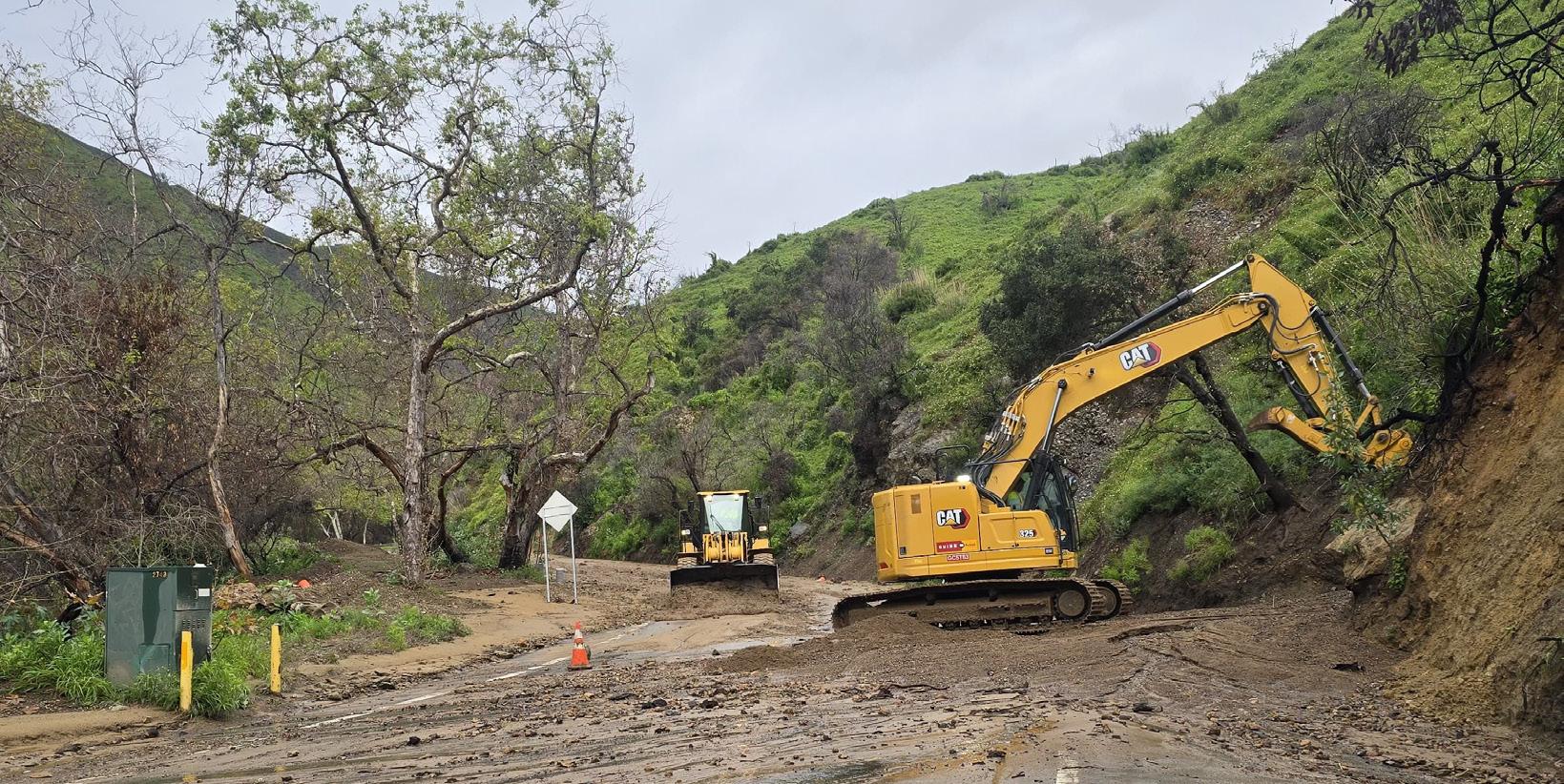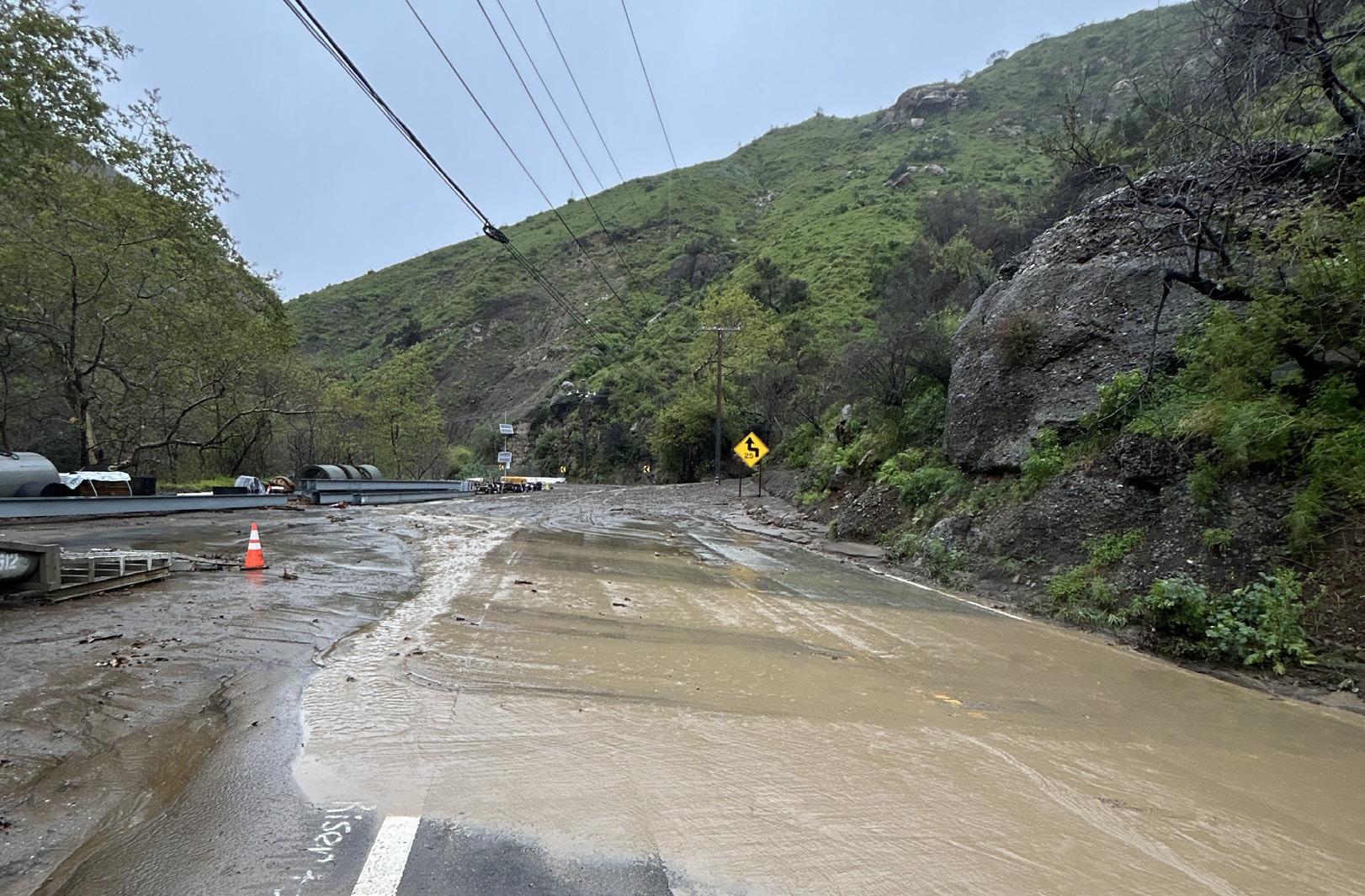 Monday’s storms brought significant mud and debris flows to State Route 27, also known as Topanga Canyon Boulevard, particularly within areas already weakened by the Palisades Fire burn scar. At least eight locations along the 3.6-mile stretch between Pacific Coast Highway and Grand View Drive were blocked by debris. The roadway remains