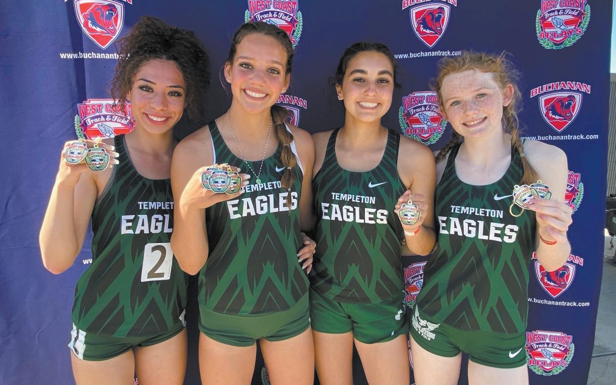 (From left) Kennedy McAdoo, Keani Neuhs, Brooklyn Thomas, and Kate Nicholson broke the school record for the 4x400m relay with a 4:02.83 time at the West Coast Relays in Clovis on Saturday, April 1.