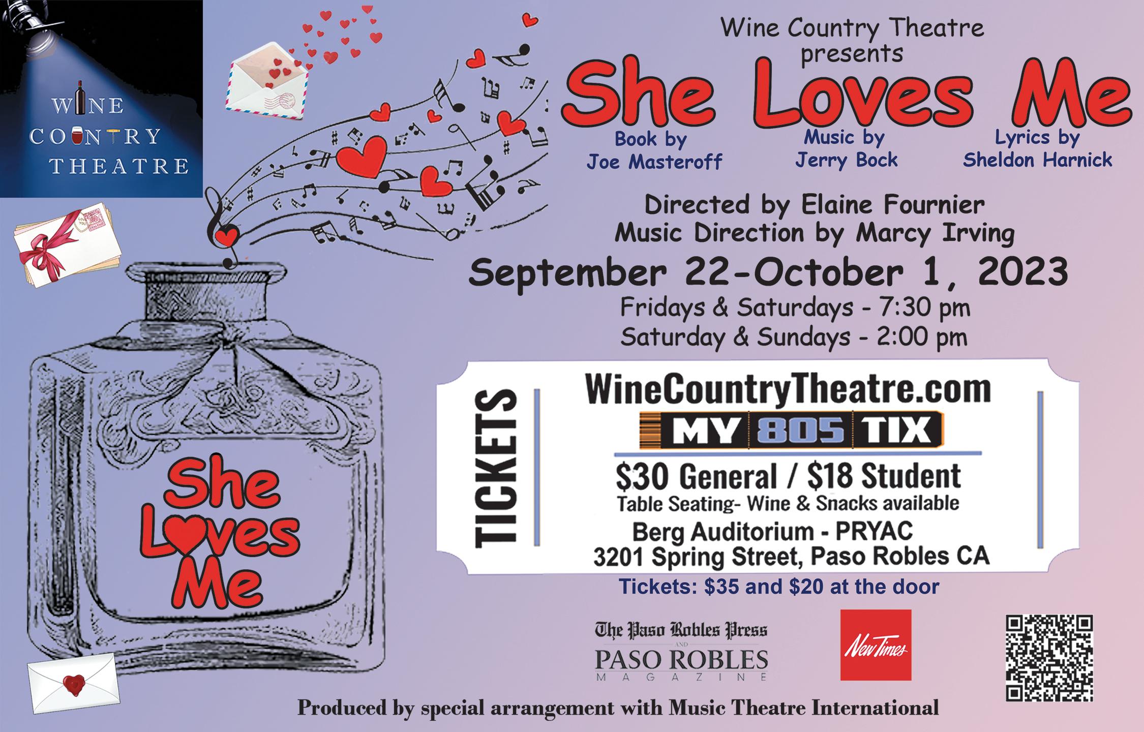 “She Loves Me” will be presented at Berg Auditorium. Show dates are September 22, 23, 24, 29, 30, and October 1. Friday and Saturday evening shows start at 7:30 p.m., and matiness are presented on Saturdays and Sundays at 2 p.m. Seating is general admission. Tickets are $30 for general and $19 for students. For more information, contact Cynthia Anthony at (805) 610-0786 or email Laurie at laurie@ winecountrytheatre.com.