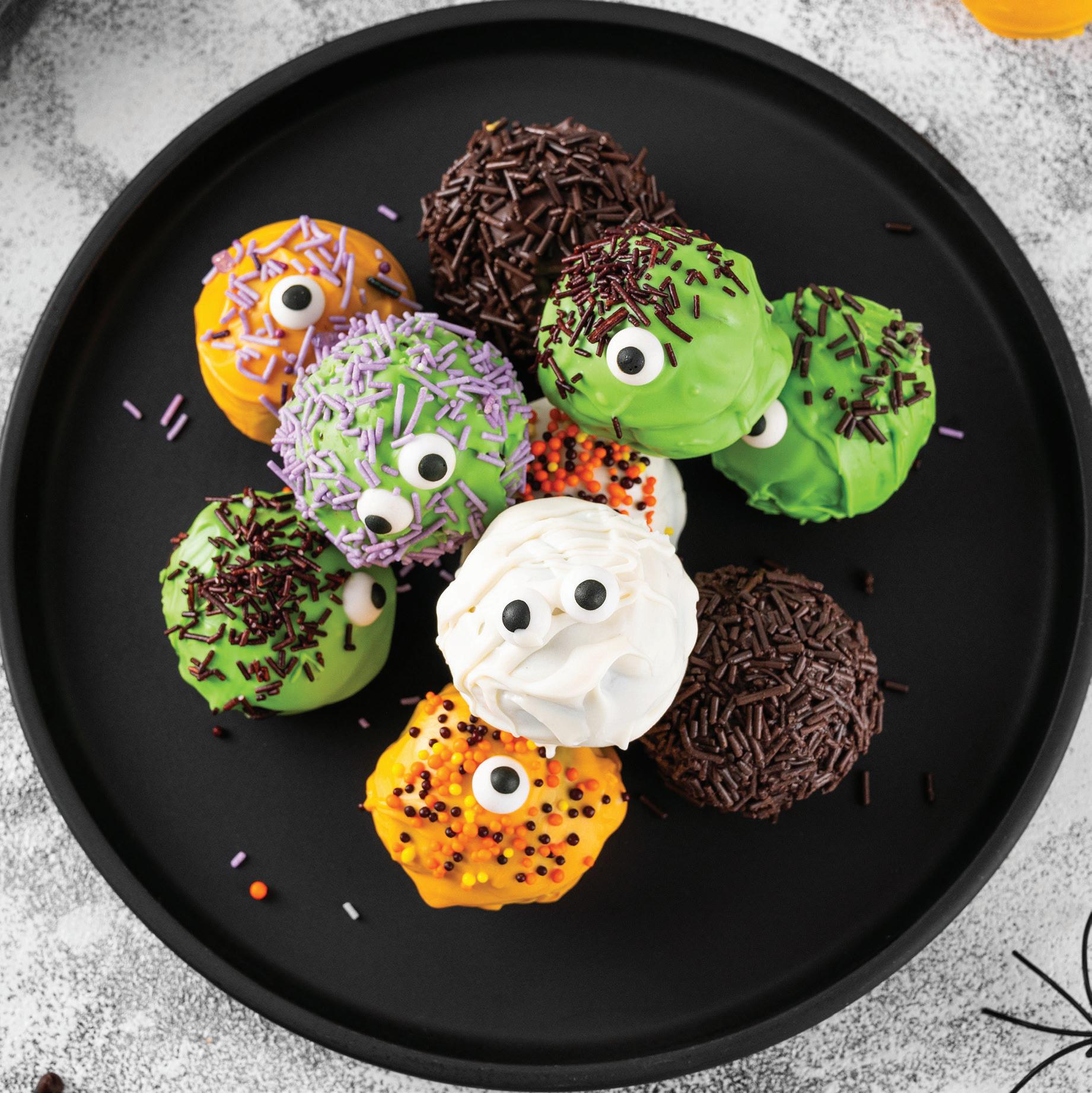 Place candy eyes on each truffle to give them a spooky specter look. Optionally, you can add a plastic spider ring on top for an extra creepy touch.