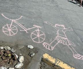 (Left photo) A lizard is spotted near one of the painted rocks placed around town by Betty Woody. (Right photo) Local artists create ‘street’ art expressing the joy of owning a bike.