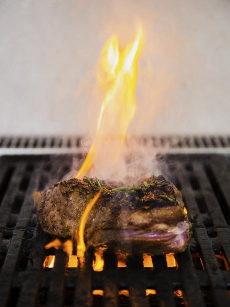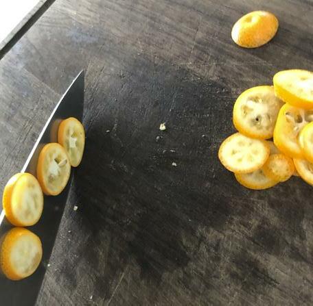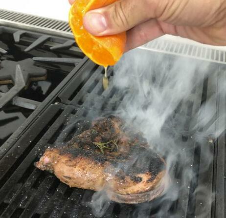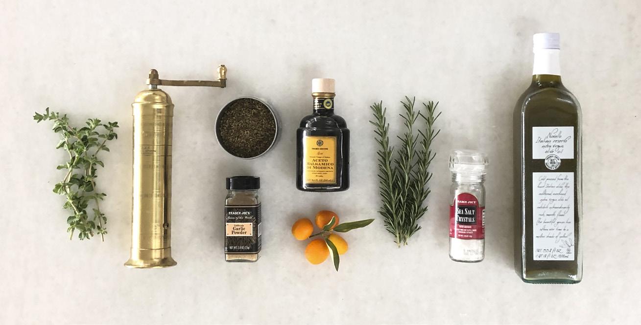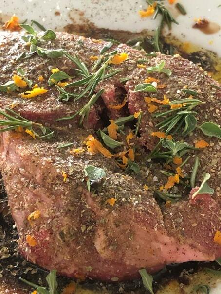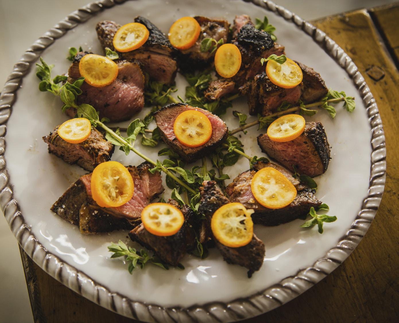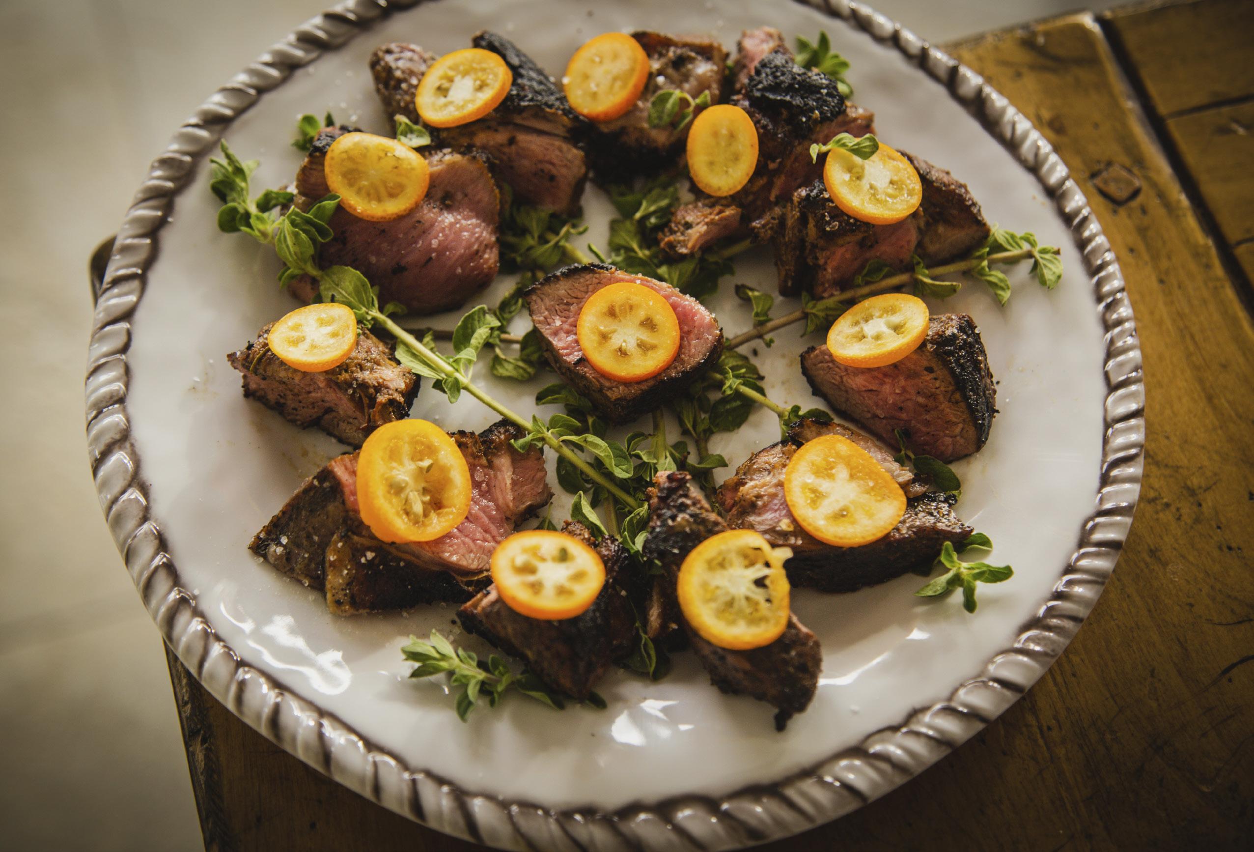 Toss the steak in the balsamic and olive oil, then coat with herbs, spices and zest. Drizzle each side of the steak with fresh squeezed citrus. Grill the steak on medium/ high heat, 3-4 minutes each side. Add the thinly sliced kumquats as a garnish.