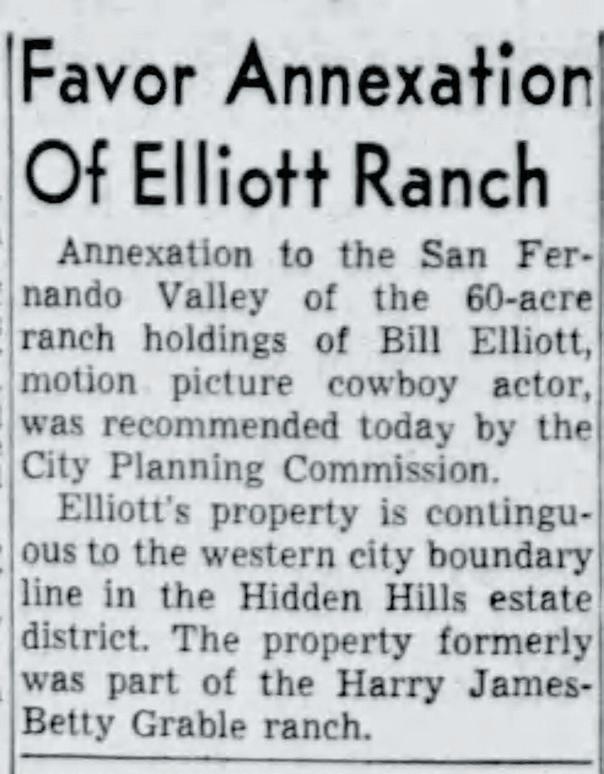 In 1958, a portion of the Baby J Ranch was purchased by movie star cowboy Wild Bill Elliott. Similar to Betty Grable and Harry James, he renamed the land the “Double Bar-A Ranch” in honor of his daughter, Barabara. Aligned with the frontier essence of early Calabasas and Hidden Hills, Elliot was known for starring in such countless Western motion pictures, with only a few being “The Great Adventures of Wild Bill Hickok” (1938), “Calling Wild Bill Elliot” (1943), “Hellfire” (1949), and “The Showdown” (1950). Born Gordon Nance, he was a prominent figure in Western films, which is how he became to be known by his assumed name, Wild Bill Elliott.