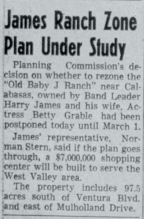 Outside of her career, Betty married one of the Swing Era’s most talented Big Band trumpeters, Harry James, in 1943. To escape the Hollywood hullabaloo, the couple purchased a large parcel of land in Calabasas and soon to be Hidden Hills area behind the Boething Treeland Nursery, which they transformed into the Baby J Ranch. Hidden Hills’ developer A.E Hanson was friends with Betty and Harry, and around 1950, he had to ask their permission to begin developing Hidden Hills due to the fact that the future city abutted the couple’s ranch.