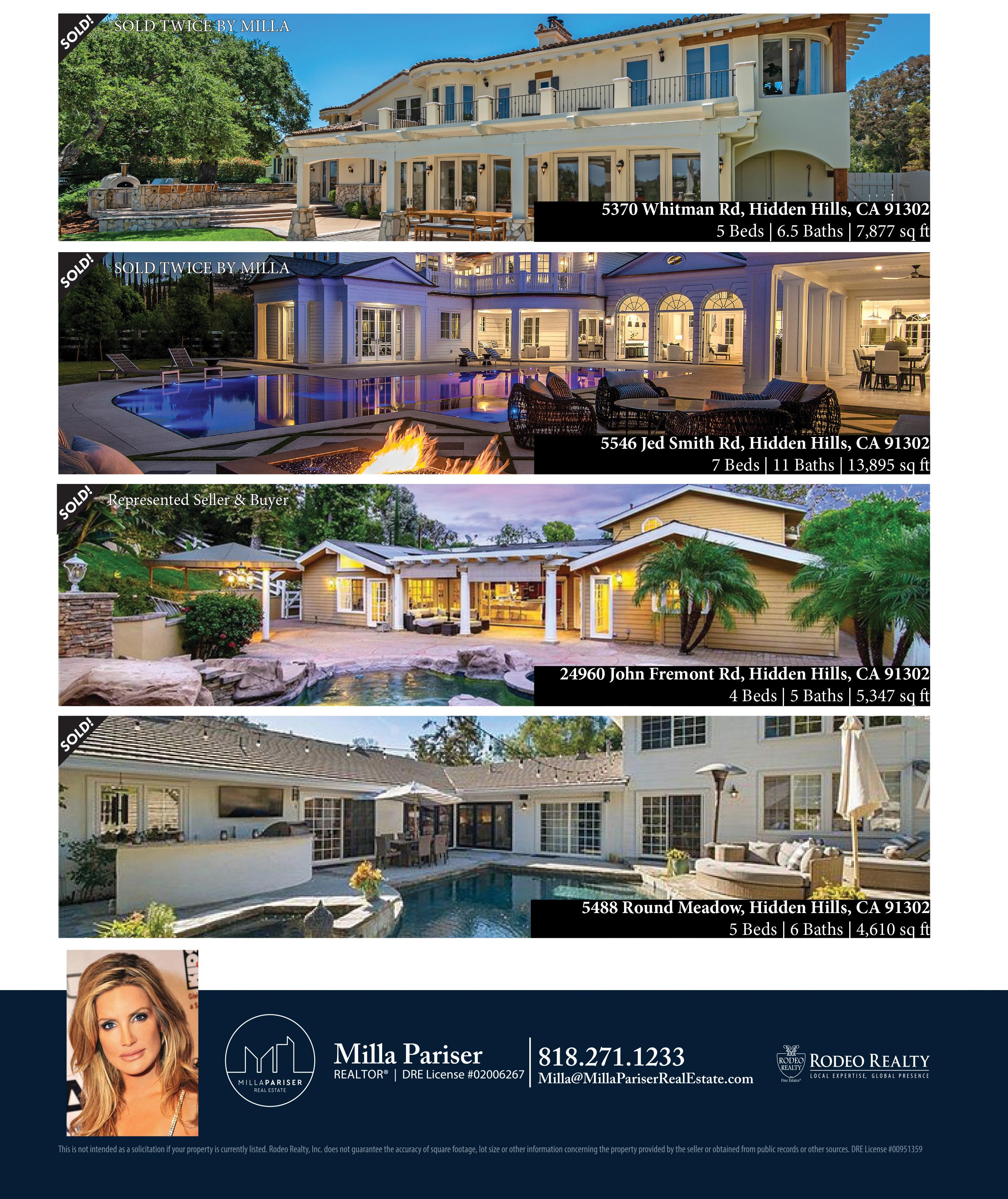able to communicate the potential of every home. THANK YOU TO MY LONG-TIME NEIGHBORS FOR PUTTING THEIR TRUST AND CONFIDENCE IN ME. It is the greatest of compliments when those who have known you the longest believe wholeheartedly in what you can accomplish.” 24929 JIM BRIDGER $3,450,000 SOLD IN TEN DAYS 5395 JED SMITH $4,495,000 5565 JED SMITH $2,995,000 5697 HOBACK GLEN $7,950,000 REPRESENTED BUYER SOLD SOLD SOLD IN ESCROW