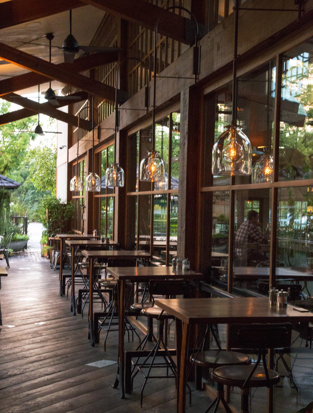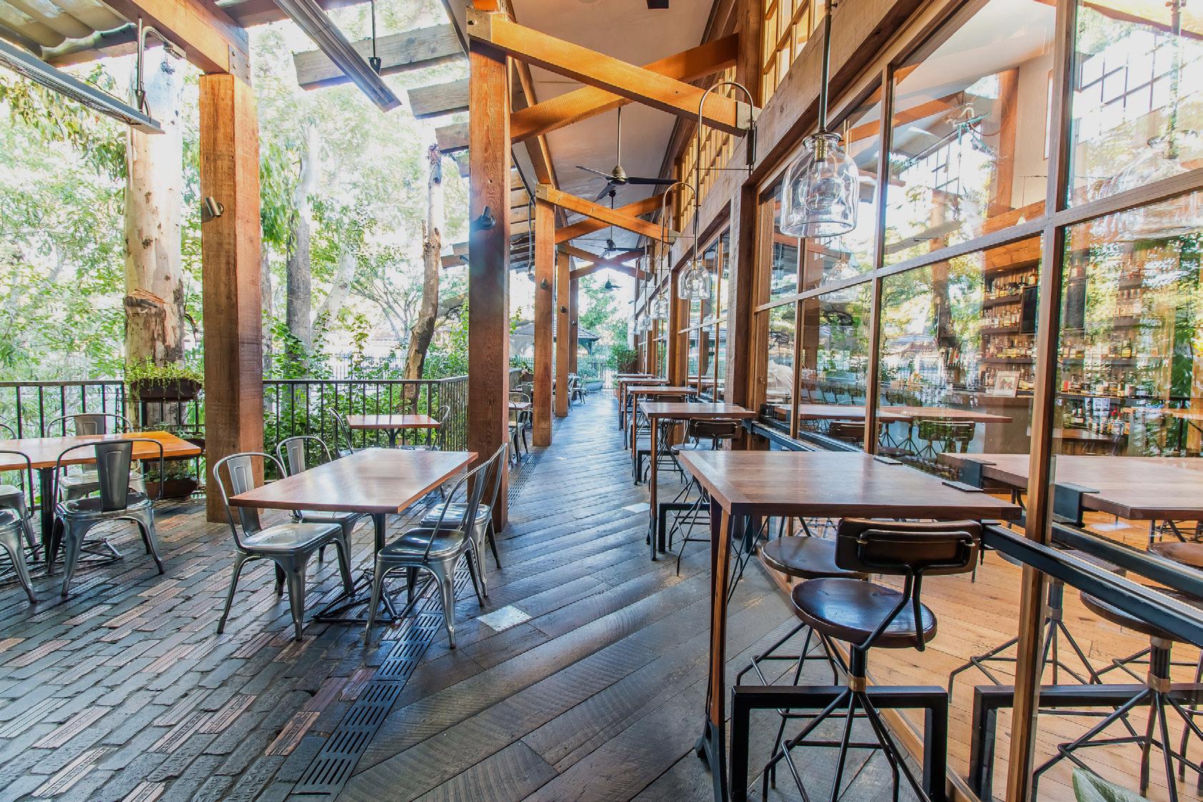 Schaeffer aimed to infuse Pedalers Fork with the lush, rustic energy captured by the Pacific Northwest, as well as a bit of a ski chalet look. “One thing I love about visiting [the northwest and different mountain towns] is the active lifestyle community: how everyone is so together. You all go out on a big ride together, come back, celebrate together, and I just wanted that energy. So I wanted the architecture to come from those places.” Schaeffer was very hands-on in the design of the building. He wanted to incorporate the natural greenery, as well as the softly babbling creek that so idyllically runs parallel to the restaurant. He succeeded, as the building looks and feels as though it has been there for thirty years. It has the distinction of fitting in with the quirky backdrop of Old Town Calabasas, the rustic reclaimed wood of a Utah ski chalet, and the elegant, warm glow of a beer garden.