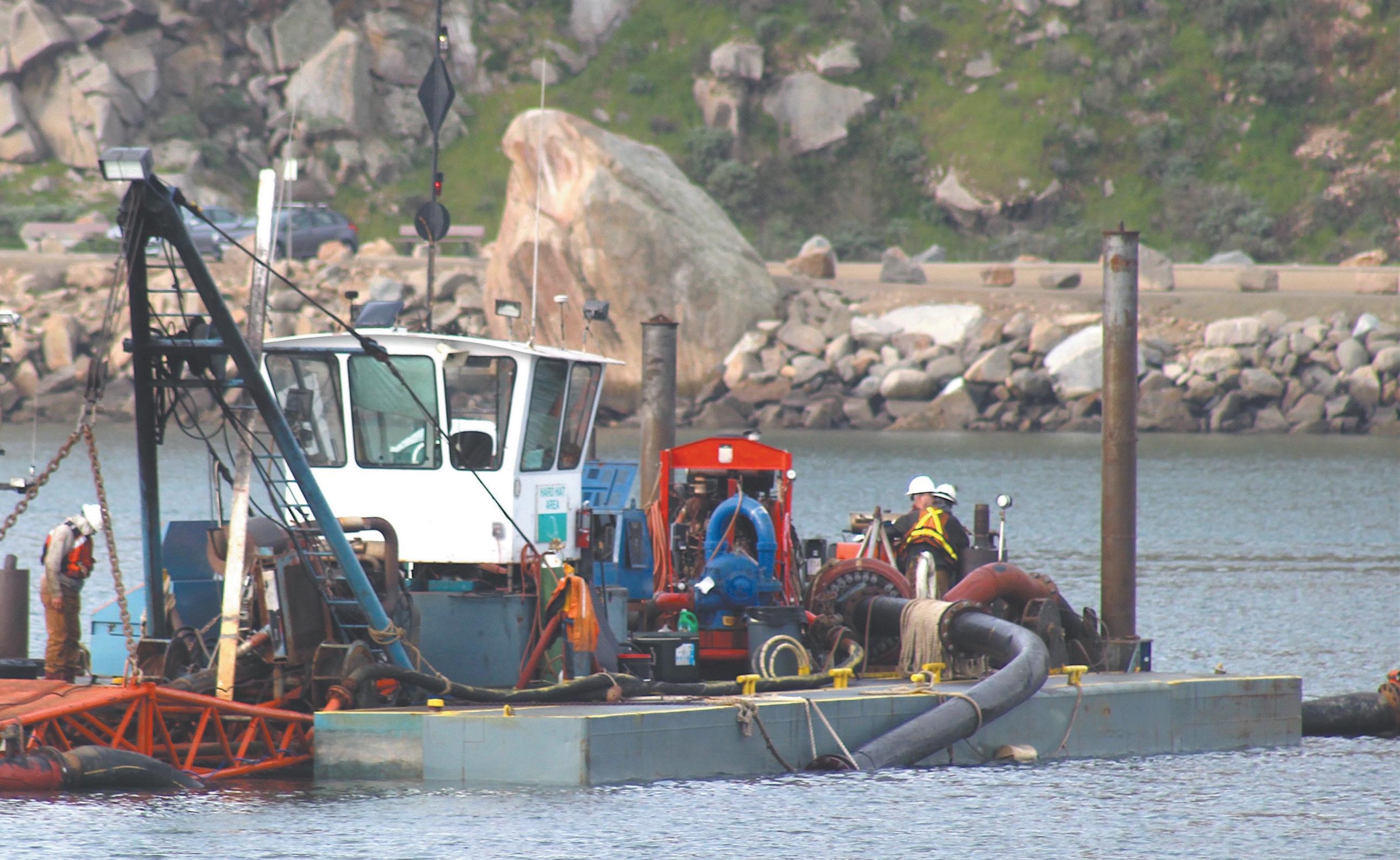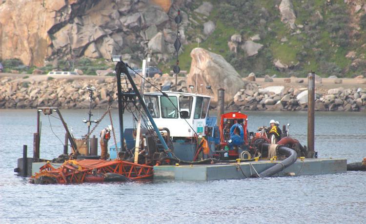 A pipe dredge like this one employed by Ahtna Design-build Corporation was in Morro Bay Harbor in 2017 to dredge the Harbor Channel (from the harbor mouth to the T-piers). A similar dredge is expected to be utilized sometime in fall 2025 to dredge out the Harbor Navigation Channel from the T-piers to the launch ramp. Photo by Neil Farrell