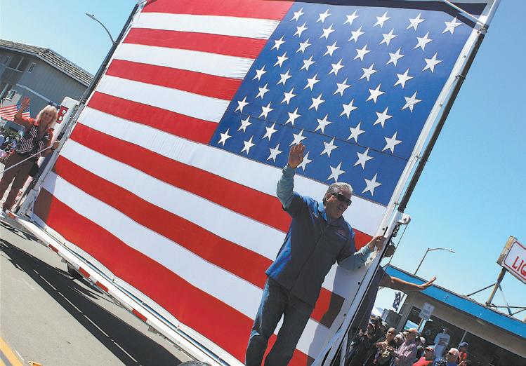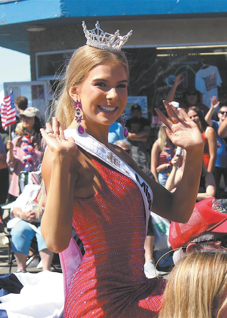 n estimated 22,000 people turned out on the 4th of July for the Annual Lions Club Independence Day Parade. And while the day dawned beautiful and sunny, the normal fog rolled in to cool things off a bit. Cool off, that is, except for the fish mobile entry by the Cayucos Citizens Advisory Council, which had a rock 'n' roll band with Billy Foppiano playing surf music until the custom-built boat that looks like an albacore tuna caught fire and was disabled. Volunteers from the crowd jumped to the rescue and pushed the car along the parade route until the fire chief hooked up a tow strap and towed the car like a [giant] fish out of water. Among the entries was Miss California Teen USA Paige Gonor, who sang the national anthem for the crowd when she reached the judge's stand.