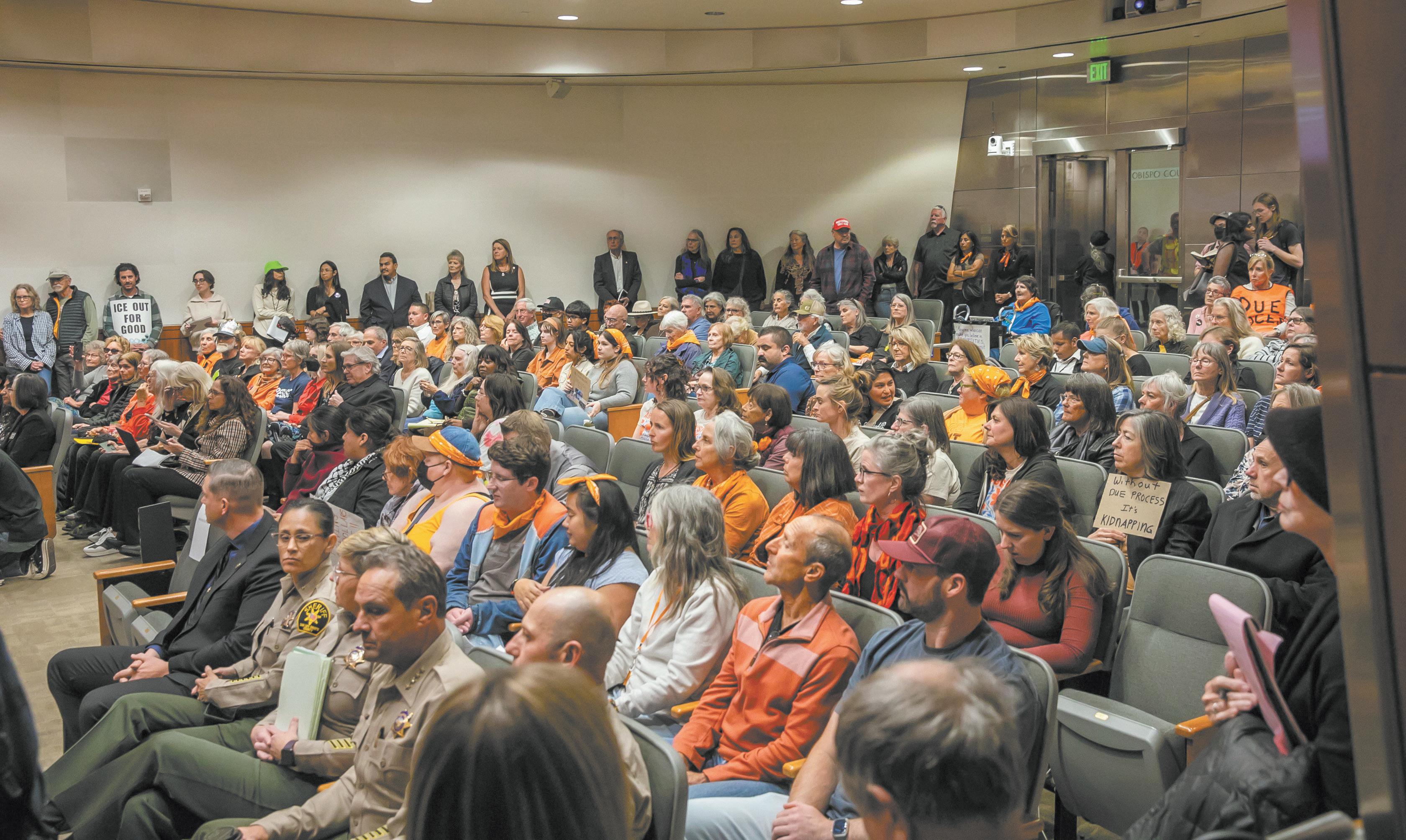 A crowd of activists stood outside the San Luis Obispo County Courthouse on Tuesday, holding their signs up for those entering the SLO County Supervisors Chamber meeting across the street. They shouted disapproval of ICE, asking for the county to become an ICE-Free Zone, and making comparisons between ICE and the Gestapo. Inside the County Government Center, the supervisors’ chamber was packed with community members filling the seats, lining the walls, and even filling an overflow room next door.