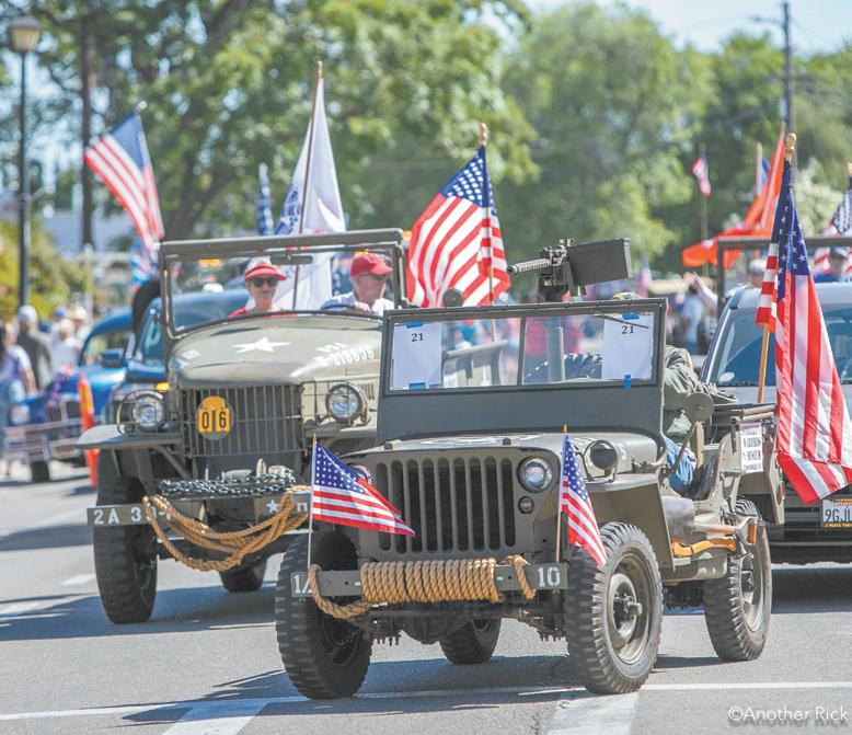 Military jeeps travel down Main Street in Templeton during the city’s Fourth of July Parade. In the background is