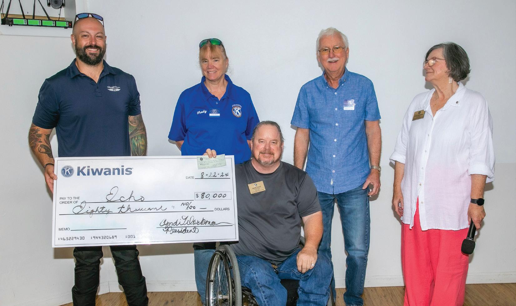From left are Austin Solheim, a director with ECHO; Judy Meyer, Kiwanian; Mark Dariz, Kiwanis treasurer; Blaine Stauffer, Kiwanian; and Cyndi Workman, Kiwanis president. They are shown holding up the real and ceremonial checks for $80,000, the amount donated by the Kiwanis to ECHO. Photo by Rick Evans