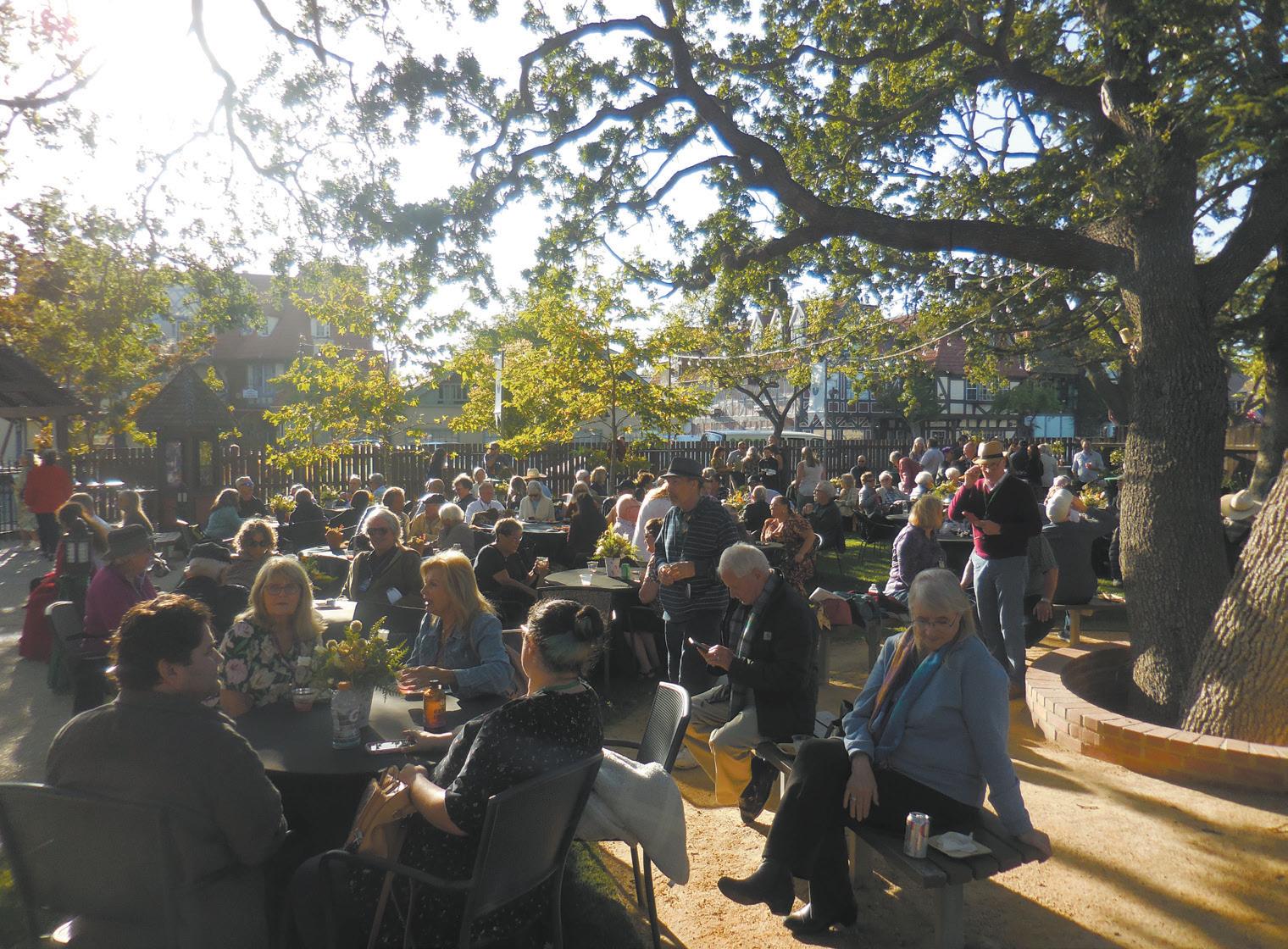 (Left) Molly Dobbs entertained the audience with the song “The Best is Yet to Come,” composed by Cy Coleman to lyrics by Carolyn Leigh. (Right) Guests at the Solvang Theaterfest/PCPA anniversary celebration gather in the Solvang Festival Theater garden while enjoying the cocktail hour. Photos by Devyn Marseilles