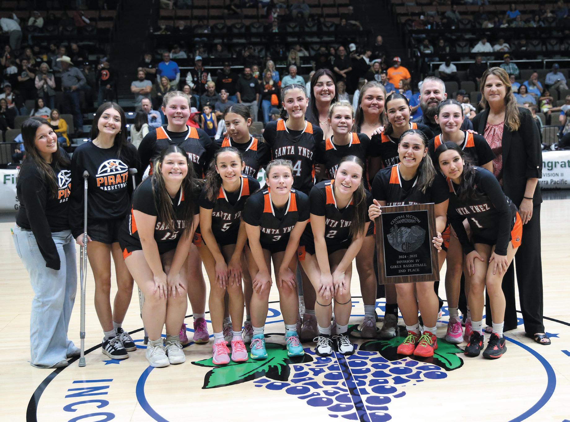 The Santa Ynez High girls basketball team pose for a team photo, with the section finalist plaque, on Feb. 28 after the CIF Central Section Division IV championship game in Fresno. The second-seeded Pirates lost to top-seeded Immanuel 58-36 in the title game. Photo by Cheyenne Agin