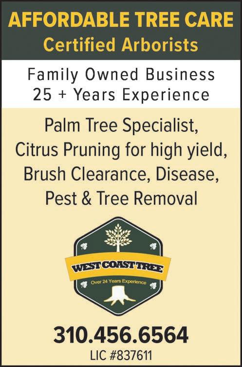 A ordable Tree Care Certified Arborists, Family Owned Business, 25 + Years Experience. Palm Tree Specialist, Citrus Pruning for high yield, Brush Clearance, Disease, Pest, and Tree Removal. Call 310456-6564. West Coast Tree. LIC #837611