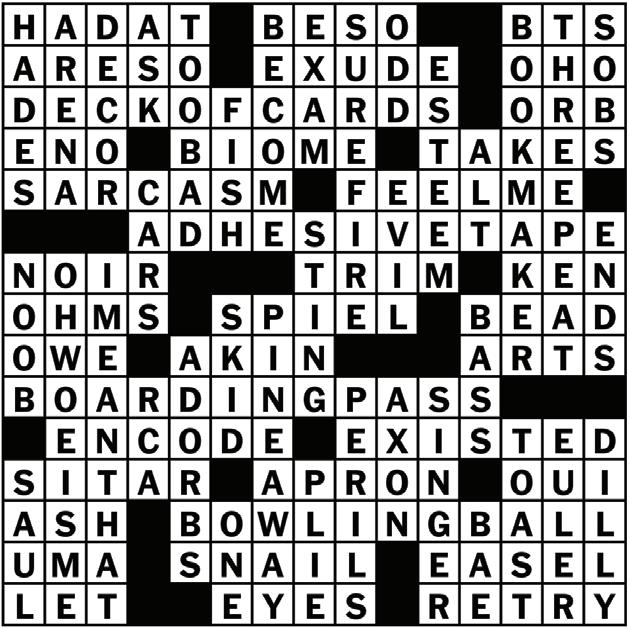 ACROSS 1 N.F.L. team with a logo of a bird’s head, for short 4 Tiring journey 8 Something you might pick up from a restaurant 13 Conjunction in a text 14 Jazz singer/pianist Krall 15 Experts 16 Online tabloid based in L.A. 17 Worth discussing, 28 Young person with uncommon wisdom, say 31 “What ___ Like” (Everlast hit) 32 Inter ___ 33 Folder at work, perhaps 36 Chart topper, for short? 37 Snowbird or Steamboat 40 Lead-in to gender 42 Trim 44 Plane figures? 45 D-Day vehicle: Abbr. 46 Dwells 49 Princess in L. Frank Baum books 50 It comes before the main event 52 Fictional swinger 54 Sit down ungracefully 55 Q: “Did you hear about the cow that cried wolf?” A: “Fake ___!” (dad joke) 58 Warm beverage cover 59 Accommodation for a long train trip ... or a hint to entering a certain letter 14 times in this puzzle 62 A goose egg 64 Instrument played with a mezrab 65 Wipe 66 Número of African countries where español is an official language 67 Quick to start in, perhaps 68 Winter retreats 69 Police title: Abbr. DOWN 1 Do something 2 Chews (on) 3 Technological breakthrough first seen on “Jeopardy!” in 2011 4 Highball offer? 5 ___ Sunday 6 Six + cinq 7 Certain Palestinians 8 Acquire flavor, in a way 9 The “R” of the M.M.R. vaccine 10 Speak to the masses 11 Long-running comic whose main characters aren’t human 12 Like Magellan in 1519 14 “My man!” 18 Oscar-winning director Chloé 20 Chanted syllables 23 Greater than great 24 Hilarity, in an internet-y spelling 26 Deer stalkers 29 Truss who was Britain’s P.M. for 49 days 30 Slow to react, maybe 32 Peaceful quaker? 34 Classic 1934 novel written in the form of an autobiography 35 Worrisome 38 Inbound or outbound thing: Abbr. 39 Middle ___ 41 Wawrinka of tennis 43 “Once again …” 47 Weigh station sight 48 Pressed 49 Spanish gold 50 Hop aboard? 51 Rappers, in a sense 53 Parcel unit 54 [Check this out!] 56 Man-eater 57 Turn into a PDF, perhaps 60 Ask some inappropriate questions 61 Knucklehead 63 “The devil’s lettuce” PUZZLE BY DREW SCHMENNER Online subscriptions: Today’s puzzle and more than 7,000 past puzzles, nytimes.com/crosswords ($39.95 a year). Read about and comment on each puzzle: nytimes.com/wordplay. ANSWER TO PREVIOUS PUZZLE The New York Times Syndication Sales Corporation 620 Eighth Avenue, New York, N.Y. 10018 For Information Call: 1-800-972-3550 For Release Thursday, August 24, 2023 Edited by Will Shortz No. 0720 Crossword