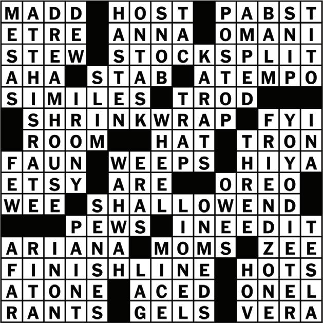 PAGE B-10 • Thursday, August 31, 2023 Malibu’s Award-Winning Community Paper Since 1946 malibutimes.com SPORTS ACROSS 1 Word with dirty or car 5 Studio caution 10 Designation that’s cheaper than “vintage,” usually 14 Locale of the house depicted in “American Gothic” 15 Vaughn of “True Detective” 16 Cavort 17 For the ages 18 Submit 19 17-Across + 33 Morty’s cartoon pal 35 32-Across + 33-Across = 35-Across 36 French friend 37 Where gummy bears were invented 39 Hollywood’s Howard 40 Locale for the hustle and the funky chicken 42 Not just a little 43 40-Across + 42-Across = 43-Across 44 Oscar nominee for “Pollock” and “The Truman Show” 46 Flock members 48 Foreign refusal 49 One on top of another on top of another … 50 Words of rejection 53 In which one dot represents an “a” 56 Swindles 57 Feature of a wedding dress 59 56-Across + 57-Across = 59-Across 61 Discharge 62 Order 63 Clarifying words 64 “Como você ___?” 65 Schedule entries 66 Early 20th-century art movement DOWN 1 Item in a diner display 2 “I goofed!” 3 Baby’s boo-boo 4 Enzyme in dairy pills 5 Attention-getting cry 6 Most of 1999 7 Cost of a hand 8 Cube put down someone’s shirt, in a prank 9 Set up again for billiards 10 Bars for checking people out 11 Fruit in the liqueur patxaran 12 Things that are folded on a Scottish Fold cat 13 Turns red, say 21 The 2% of “2%” 23 Car with a “bowtie” logo 25 Actor Werner of “Jules and Jim” 26 Unlikely to speak first, say 27 Group that often holds religious services in barns 28 Peaks 29 Root in potpourri 30 Route from Me. to Fla. 31 Take care of 32 Haul aboard 34 Rea ___, graphic designer who created The New Yorker’s typeface and mascot 37 Bridge columnist Charles 38 N.F.L. team nicknamed Big Blue 41 Card game that uses jokers 43 Experience guilt, say 45 Took to the streets 47 Hebrew name meaning “ascent” 49 Showcase Showdown guesstimate 50 Slushy brand 51 Some cats 52 Bit of agitation 53 Take the ___ 54 Her first word was “Bart” 55 Oklahoma city NNW of Oklahoma City 58 Health abbr. 60 Code material PUZZLE BY GUILHERME GILIOLI Online subscriptions: Today’s puzzle and more than 7,000 past puzzles, nytimes.com/crosswords ($39.95 a year). Read about and comment on each puzzle: nytimes.com/wordplay. ANSWER TO PREVIOUS PUZZLE The New York Times Syndication Sales Corporation 620 Eighth Avenue, New York, N.Y. 10018 For Information Call: 1-800-972-3550 For Release Thursday, August 31, 2023 Edited by Will Shortz No. 0727