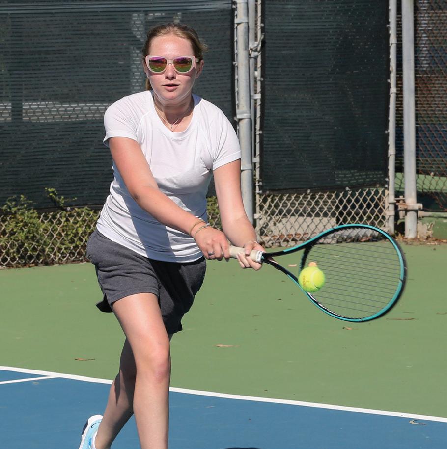Cole Ovsiowitz of the Malibu High girls tennis team delivers a backhand shot during a recent practice.