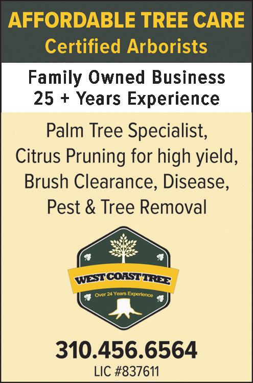 Affordable Tree Care Certified Arborists, Family Owned Business, 25 + Years Experience. Palm Tree Specialist, Citrus Pruning for high yield, Brush Clearance, Disease, Pest, and Tree Removal. Call 310-456-6564. Joseph Christman’s West Coast Tree, Inc. LIC #1109716