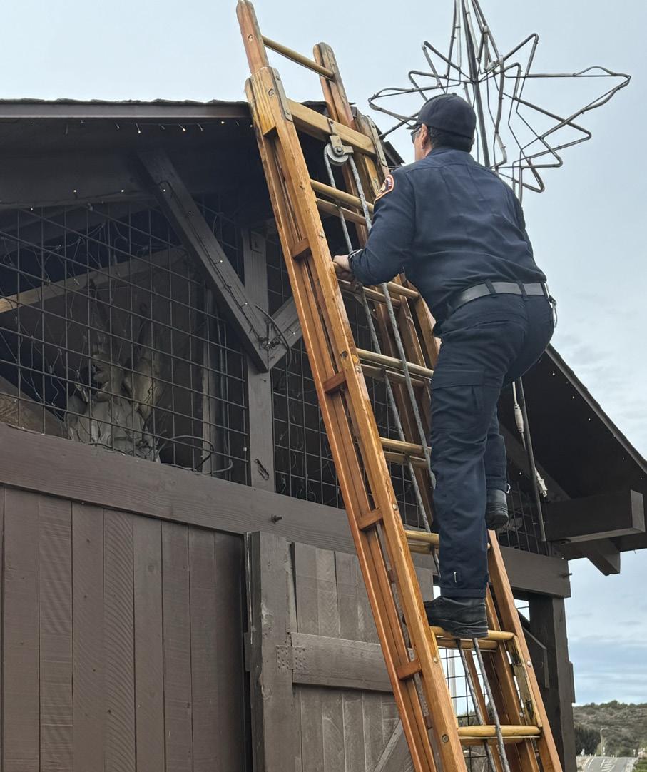 Paramedic Tony Castaneda as they took a ladder from the fire truck, climbed up the ladder, and carefully positioned a large star on the roof of the Malibu Community Nativity Scene.