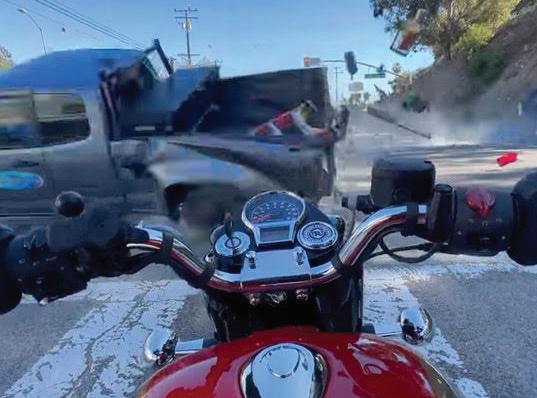 e as-yet-unidenti ed driver of a stolen 2017 Lexus NX SUV blasted down Kanan towards Pa ci c Coast Highway at excessive speed. Upon entering the T-in tersection, he did not slow down, and made no attempt to turn left or right to avoid the 30-foot-high cli straight ahead. He hit a pick up traveling west on PCH, causing it to ip over and land on top of a motorcycle waiting at the light.