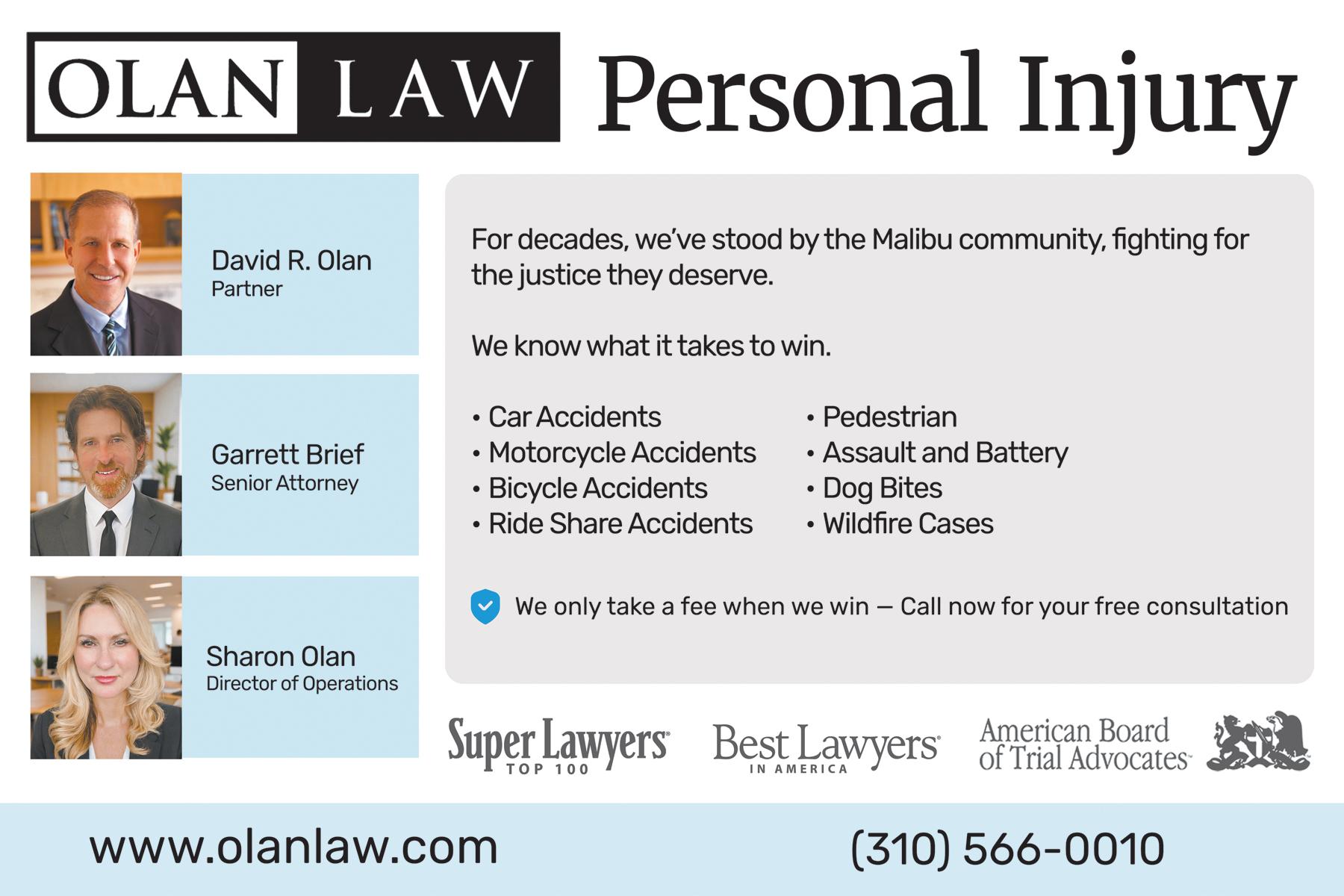 OLAN LAW Personal Injuries, Auto Accidents, Wrongful Death, Uninsured Motorist, Premises Liability, and Product Liability. Call David Olan 310-566-0010 www.olanlaw.com