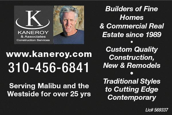 has been proud to serve Malibu & the Westside for the past 25 years, and look forward to putting it’s broad experience, creativity and craftsmanship to work for you on your next construction project. Kane Sickner 310456-6841, www.kaneroy.com Lic.#569337-Bonded/insured. Fencing