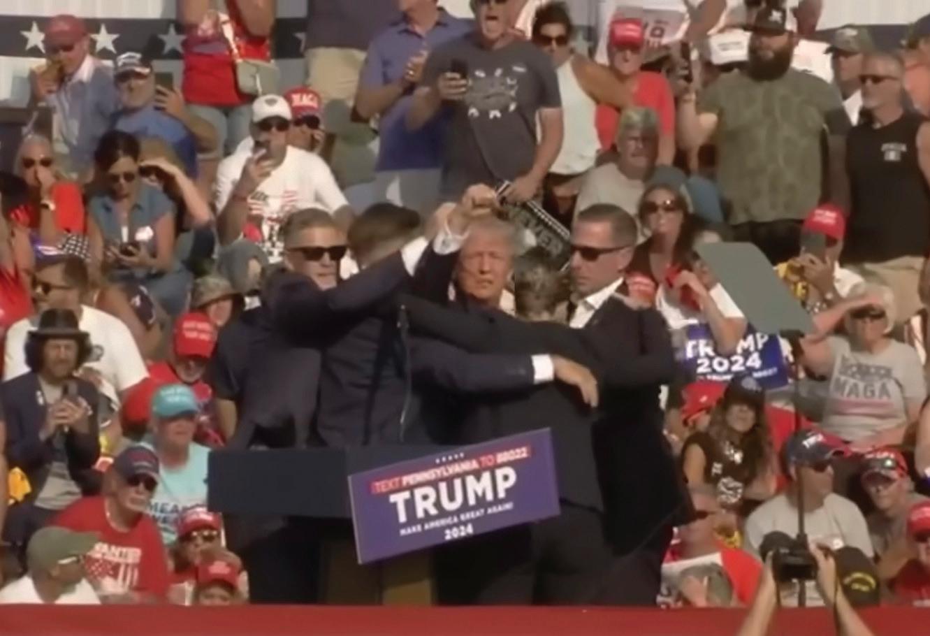was shown speaking to the crowd when gunshots rang out, and Trump’s hand went immediately to his right ear. He then knelt down as Secret Service agents jumped on top of him to shield him.